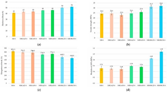 Mechanical characterization, including the determination of tensile strength, elongation at break, and modulus at 100%, in accordance with ASTM D412-06 [61], took place. These tests were performed using a KE-3000 MP universal testing machine (Kratos Industrial Equipment, Cotia, SP, Brazil). The mechanical tests were performed on a minimum of ten specimens. Hardness tests were also performed, based on ASTM D2240-15 [62], employing a portable analog Shore A durometer (Bareiss North America Inc., Stouffville, ON, Canada), model D-89610). Five measurements were taken for each specimen with a 1 s delay time following the application of the load.