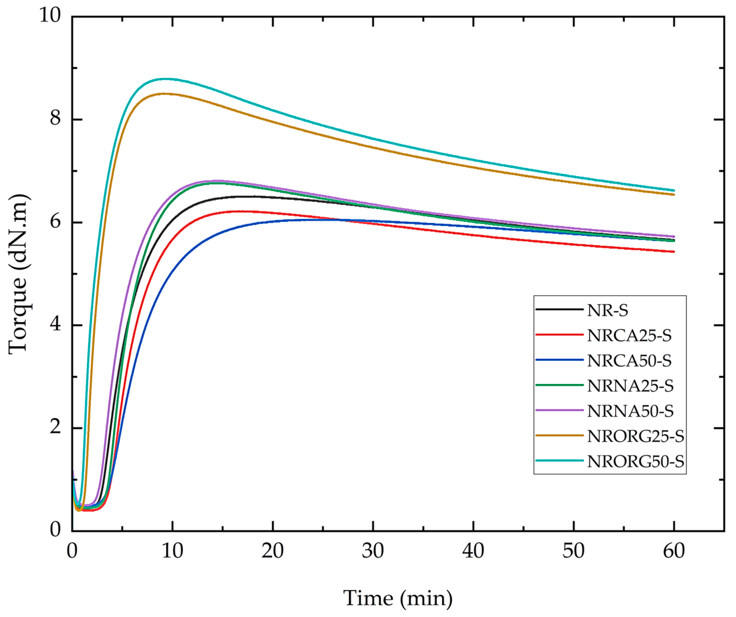 - ASTM D2084; Standard Test Method for Rubber Property—Vulcanization Using Oscillating Disk Cure Meter. ASTM International: West Conshohocken, PA, USA, 2019.