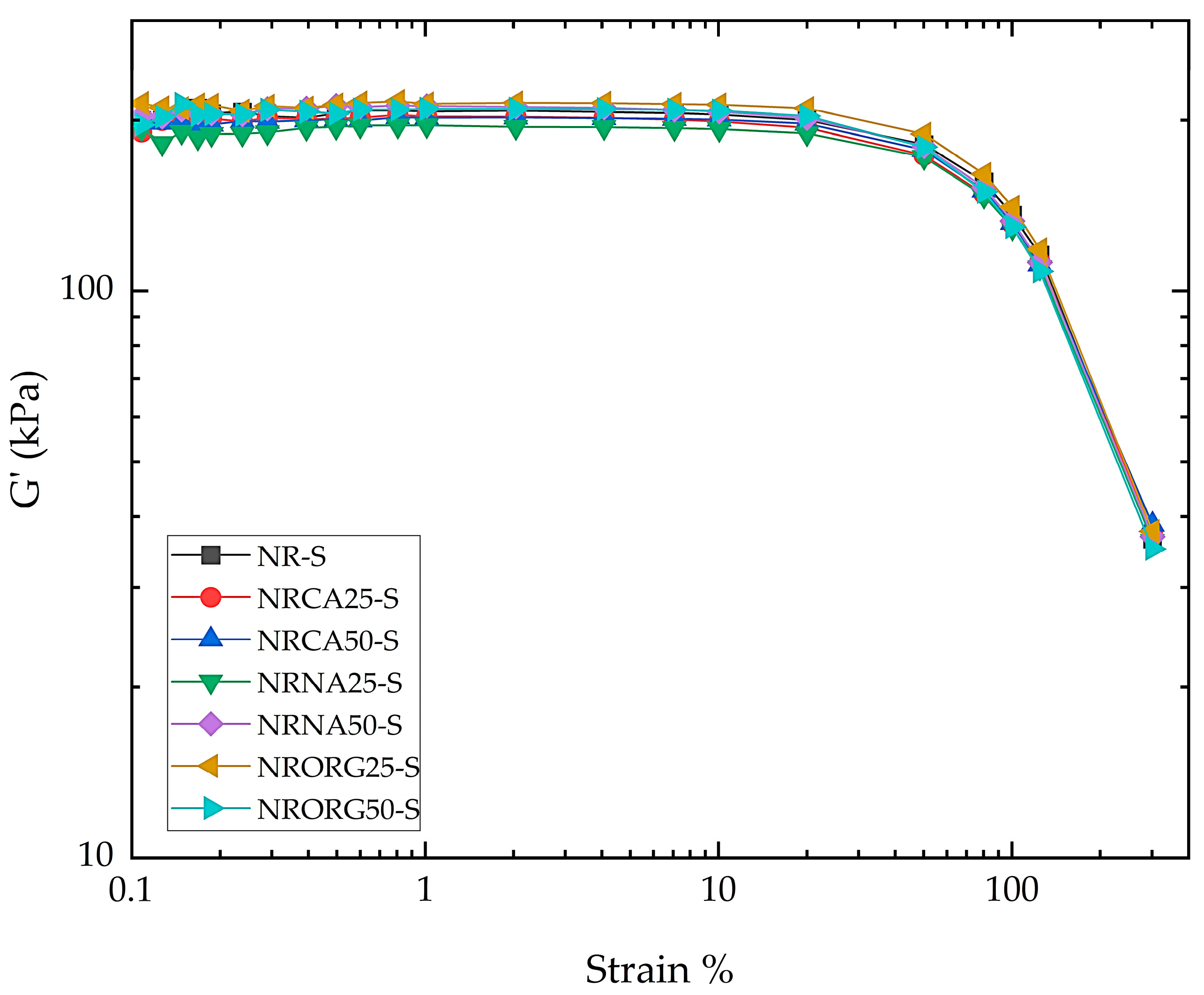 - ASTM D8059; Standard Test Method for Rubber Compounds—Measurement of Unvulcanized Dynamic Strain Sof-Tening (Payne Effect) Using Sealed Cavity Rotorless Shear Rheometers. ASTM International: West Conshohocken, PA, USA, 2022.