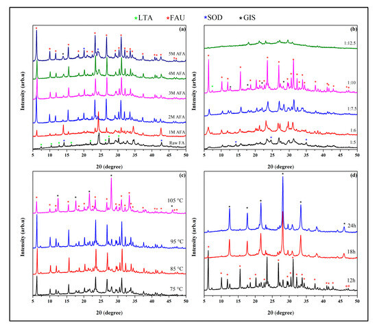 XRD patterns of zeolites synthesized from 5 M HCl-leached fly ash under various synthesis conditions and, (a) shows the effect of HCl concentration during acid pretreatment, (b) presents the effect of AFA:H2O mass ratio in the synthesis solution, (c) illustrates the influence of crystallization temperature, (d) displays the effect of crystallization time. Characteristic diffraction peaks were indexed to the corresponding zeolitic phases (FAU, GIS, LTA, SOD) based on reference patterns from the International Zeolite Association database [36].
