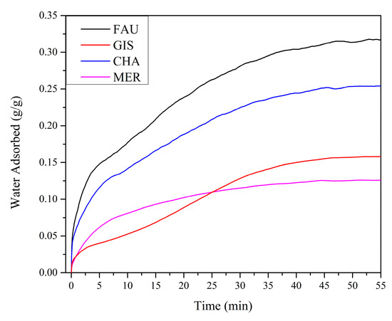 The impact of delicate balance among different fly ash treatment conditions and synthesis parameters were evaluated by measuring the water uptake amounts using the optimized benchmark products obtained in the current study. This allowed the assessment of the impact of performance of these products obtained using a waste material using fly ash. The water sorption behavior of the optimized zeolite samples (FAU, GIS, CHA, and MER) was investigated to establish the relationship between framework topology, phase stability, and adsorption performance. Figure 4 presents the corresponding sorption curves obtained under identical conditions. All samples exhibited a rapid initial uptake within the first 10 min of exposure to moisture, followed by a slower increase that stabilized after approximately 50 min, in line with previous observations for zeolitic materials [23,49]. This two-step kinetic profile is commonly attributed to the rapid filling of easily accessible adsorption sites (external surface and pore openings), followed by the slower diffusion of water molecules into the internal micropore network [49,50].