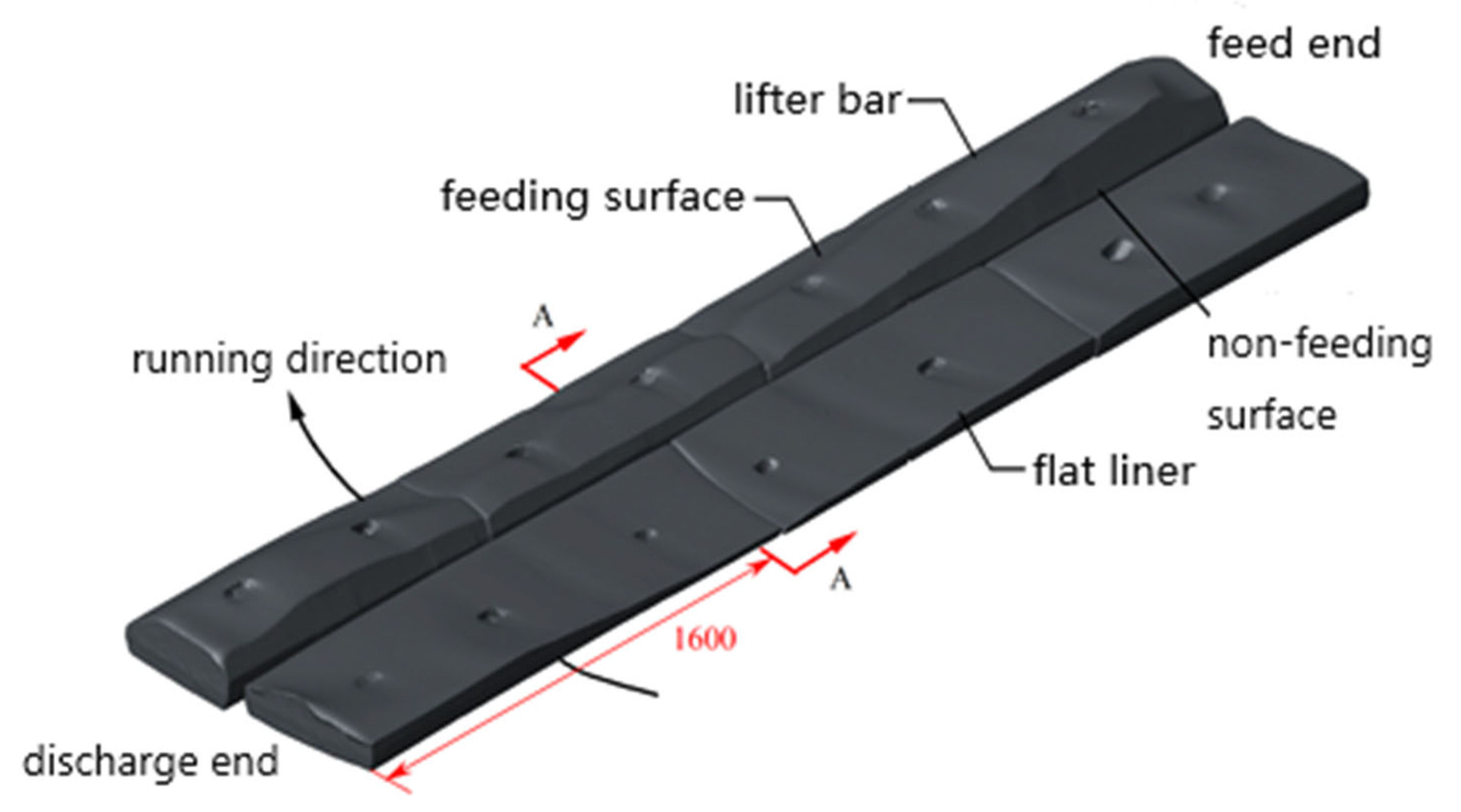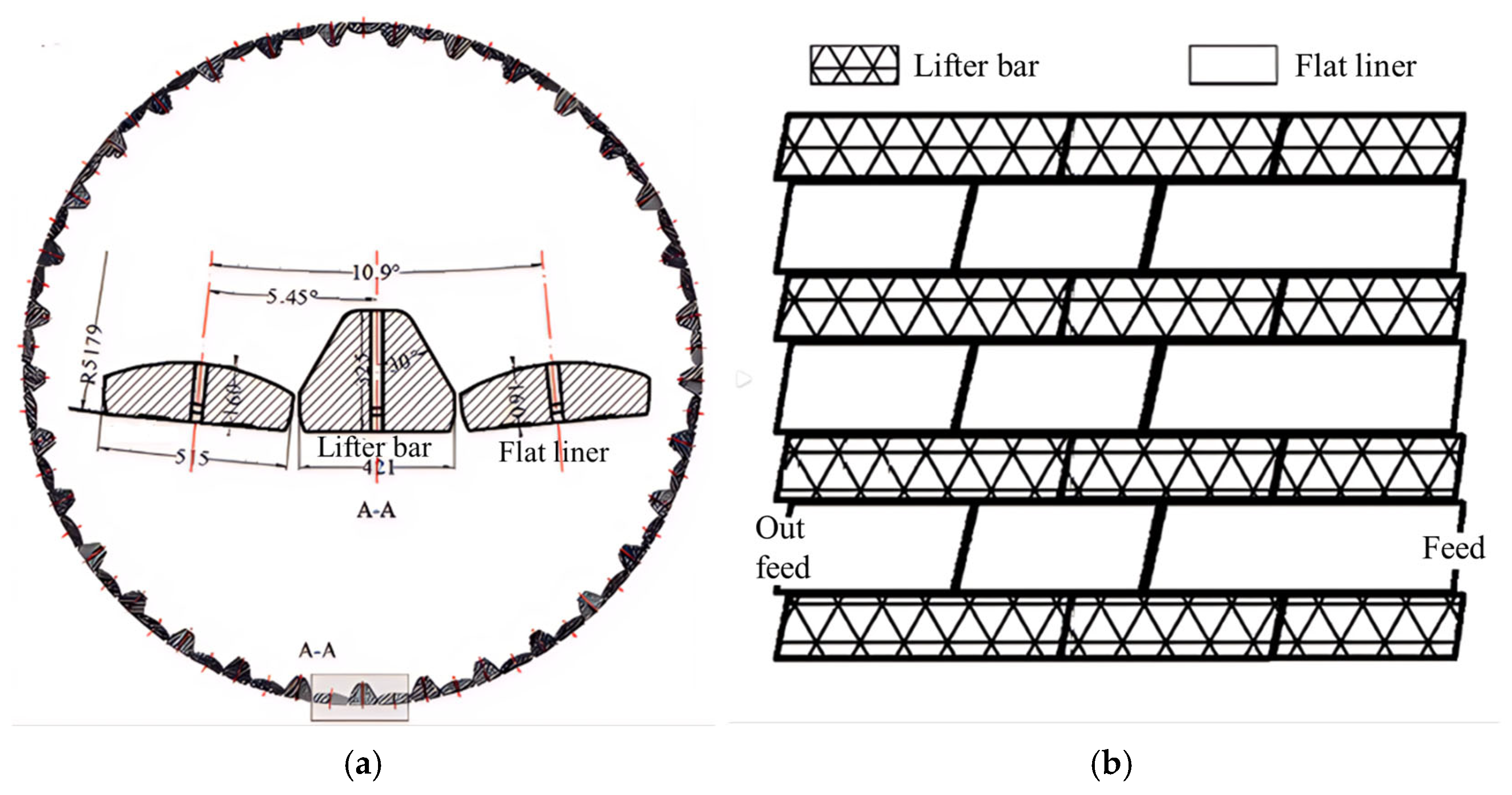 The semi-Autogenous Grinding (SAG) mill is widely used in metallurgy, mining, and other industries because of its advantages of short process, simple equipment, lower investment, and high degree of automation. The SAG mill utilizes shell liners which consist of flat liners and lifter bars to lift the ore and grinding balls to a certain height, then they are dropped and impact each other, so the ore becomes crushed. During the process, grinding is achieved by the shearing and edging action among the grinding balls, ore, and shell liner [1]. Here, the shell liner provides support, endures wear and tear, and resists shock, so the rational design of this system determined the grinding efficiency and economic efficiency of the SAG mill [2,3].