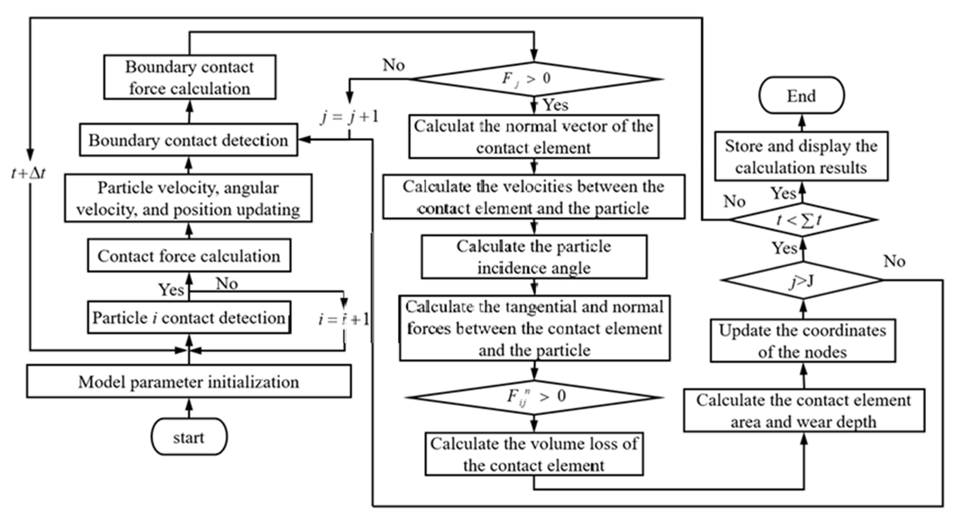 The Finnie wear model is improved by using C++ language and the EDEM-API secondary development function, which can realize the wear evolution process. Firstly, the dynamic behavior illustration and the wear loss accumulation were in the EDEM2022 software, then a Python coupling program was written to transfer the load and wear data from the DEM to the FEM. The Finnie-DEM Simulation Process is shown in Figure 7. In order to ensure that the material movement reached a steady state, the data were extracted after the mill rotated four revolutions.