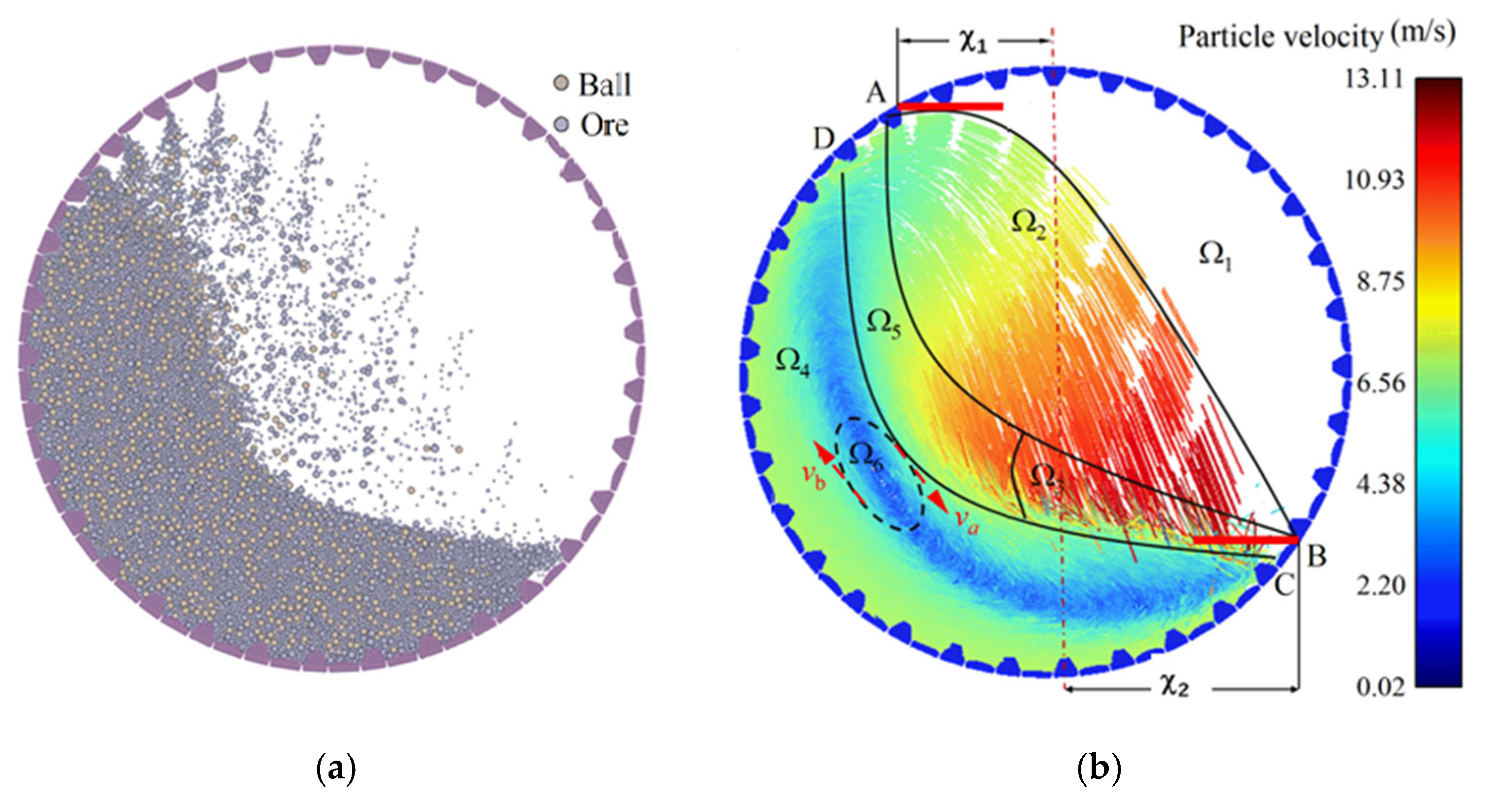 Ores are mainly ground in the dropping zone, Ω2, because there are direct collisions among ores, grinding balls, and shell liners during the dropping process and also the shearing effect of the liners. In Figure 9b there are three typical grinding effects among the materials. Firstly, ores are ground at different speeds among the materials, which involves the materials in the discharge zone, the surface materials in the grinding zone, and the inner materials in the grinding zone. Secondly, the different movement directions of the inner materials cause ores to be ground. Thirdly, the various speeds between the bottom low-speed material and the inner higher-speed material cause grinding actions on the ores. In the grinding zone Ω4 there are ring-shaped velocity traces, which means that the shearing effect is less in the elliptical orbit zone, so this zone is called the inertia zone Ω6. In the inertia zone, minerals are hardly ground at all.