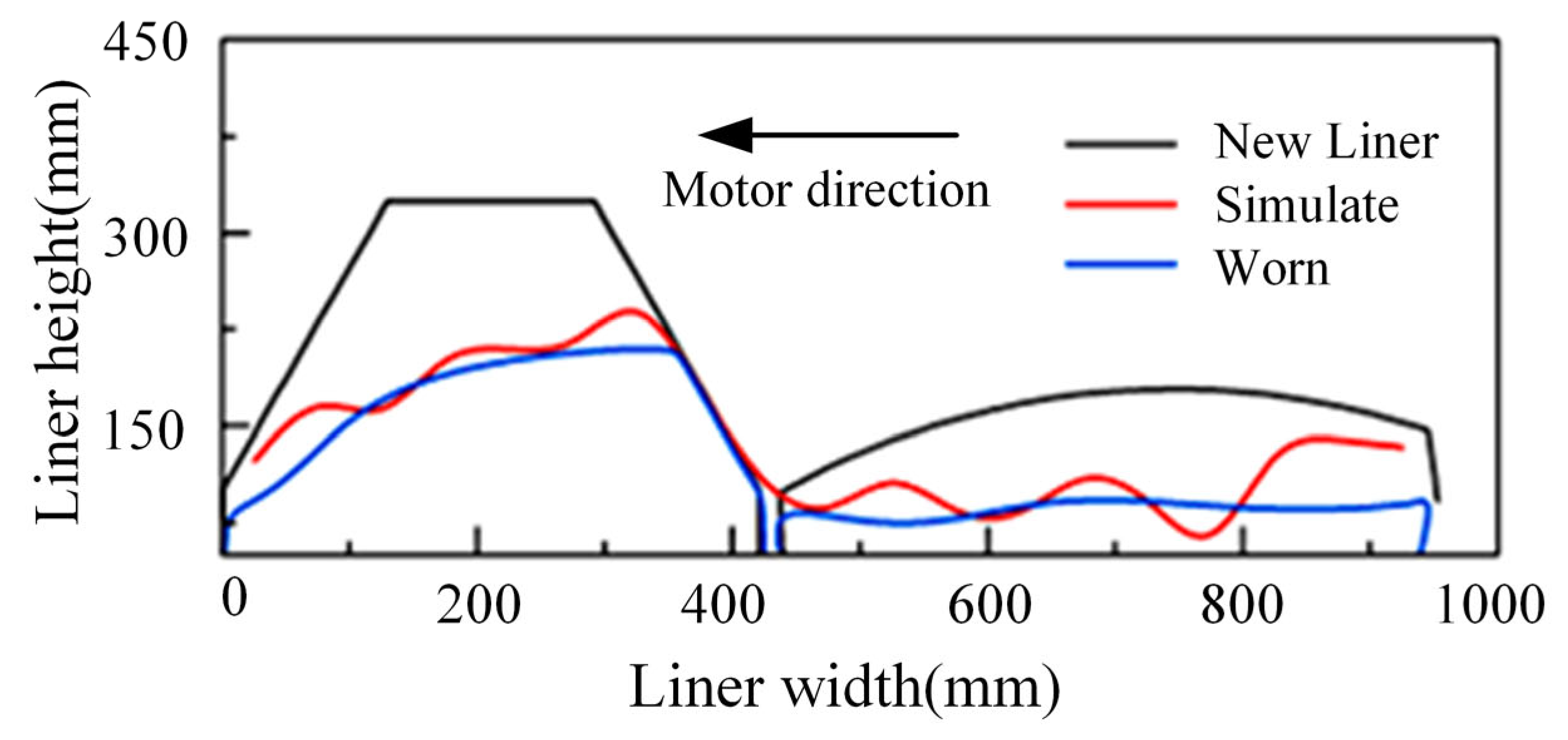 The simulated wear profile in Figure 10 is the result of the aforementioned extrapolation calculation. The average error between this profile and the on-site measured wear profile is almost the same. A slight deviation only exists at the right end of the flat liner, which arises from the omission of the liquid grinding-aid effect in actual working conditions during simulation. This further confirms that the steady-state accelerated simulation combined with linear extrapolation method can reliably reproduce the worn morphology of the liner after long-term service, while balancing computational efficiency and result authenticity.