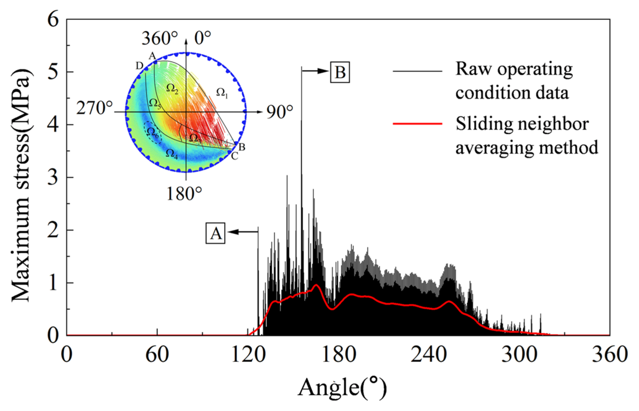 The instantaneous maximum stress–time history of the shell liner during one rotation was extracted as shown in Figure 14. The instantaneous maximum stress of the liner during operation shows a pulse distribution, which matches the instant impact of discrete particles. When the liner is near 120°, the stress increases sharply, which is most likely due to the direct impact of a few materials. As the liner rotates to around 150°, the stress reaches a maximum value. At this time, the liner is located in the grinding zone, where a large number of materials are squeezed on the upper layer of the grinding zone in the liner, so the stress reaches a maximum value. Just like the previous analysis, this is also the area of the liner where wear is greatest. Therefore, it can be reasonably inferred that the peak instantaneous stress, A, reflects the intensity of the impact on the liner. The greater the peak value, the more severe the impact on the liner, and the more likely the liner is to break and deform. Peak value B reflects the instantaneous maximum stress on the liner and the crushing effect on the material in the grinding zone. The higher the stress level near the peak, the better the crushing effect of the material in the grinding zone.