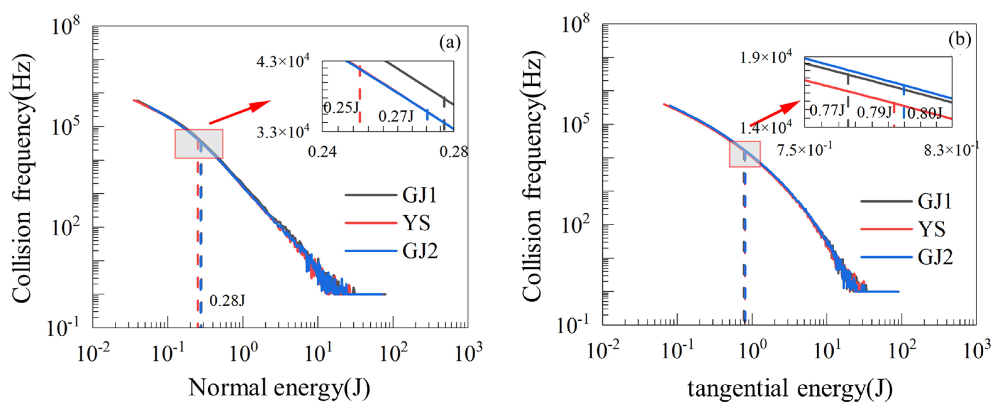 Figure 21. DEM simulation—statistical collision energy spectrum of ore under different liner structures: (a) normal collision energy spectrum of different flat liners; (b) tangential collision energy spectrum of different flat liners.