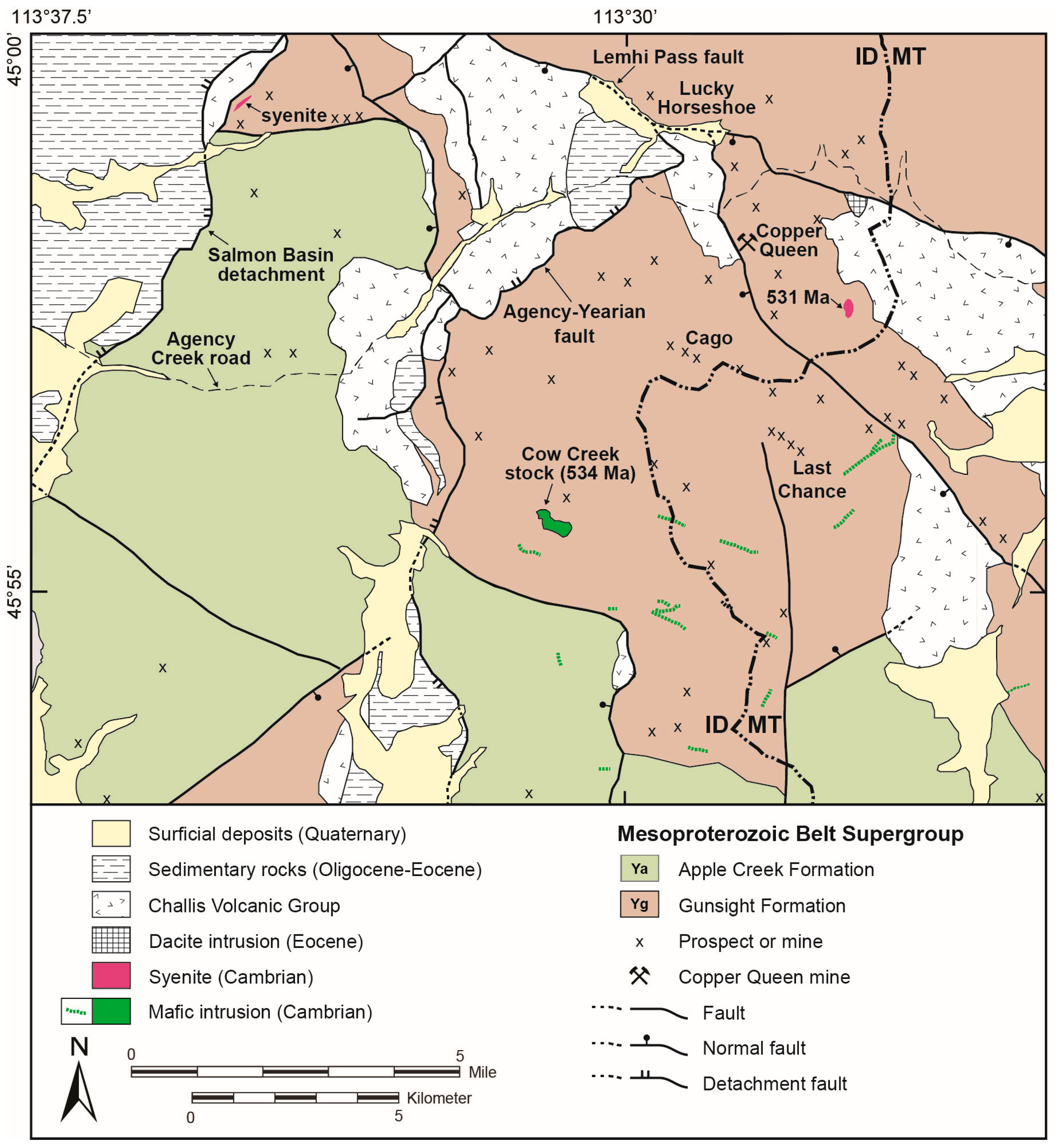 - Gillerman, V.S.; Schmitz, M.D.; Jercinovic, M.J. Copper and REE-Th Metallogeny in Lemhi County, Idaho: Magmatism and Repeated Hydrothermal Activity along a Paleozoic Continental Margin. In Proceedings of the Society of Economic Geologists 2013 Conference Abstracts and e-Posters; Society of Economic Geologists: Whistler, BC, Canada, 2013. [Google Scholar]