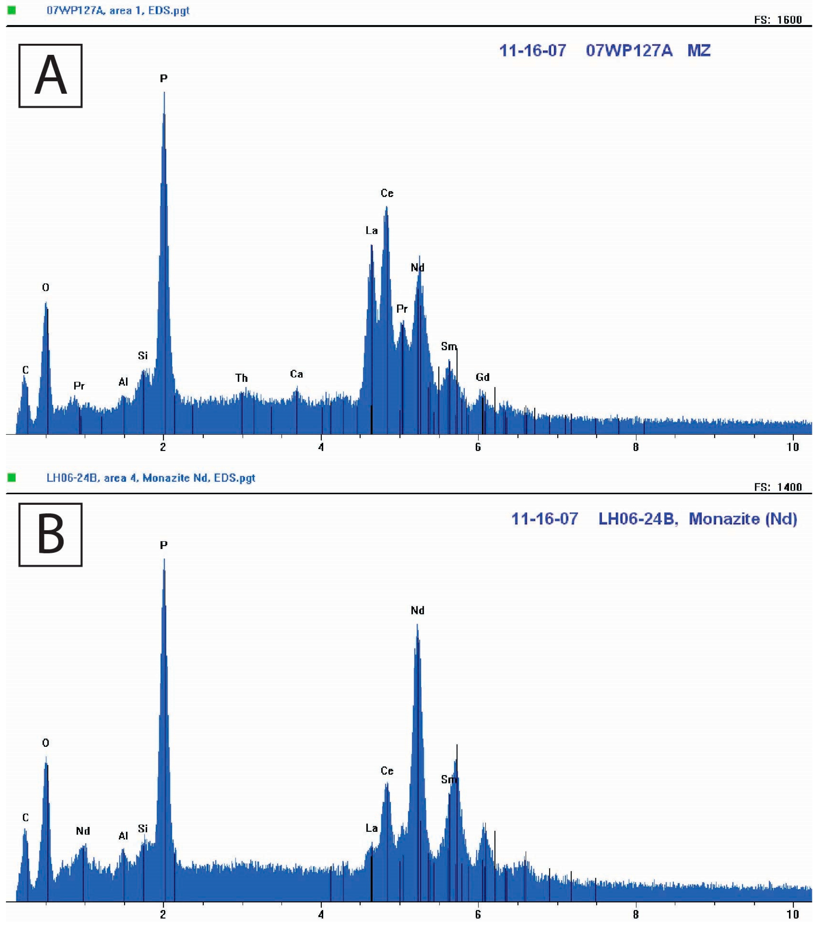| Monazite Sample (Wt. %) | LH12c2 | LH06-24A | LH-8a | LH-12 | LH12c M2 Low Th | LH12cM2 High Th | LH06-25 M3 High Y Core | LH06-25 M3 High Th Fracture | Sunshine Lode | Roberts S (07WP127B) |