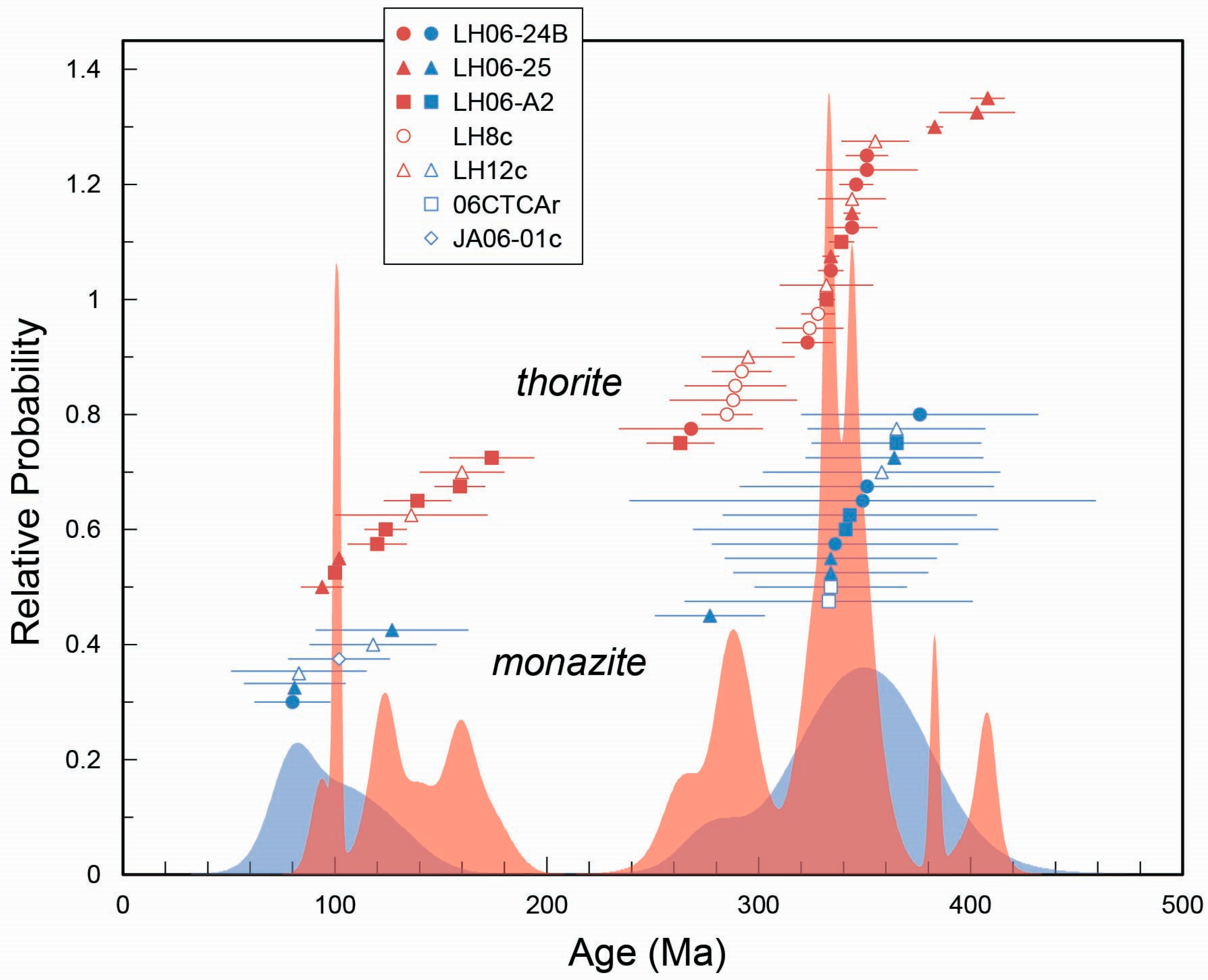 - Be Mezeme, E.; Cocherie, A.; Faure, M.; Legendre, O.; Rossi, P. Electron Microprobe Monazite Geochronology of Magmatic Events: Examples from Variscan Migmatites and Granitoids, Massif Central, France. Lithos 2006, 87, 276–288. [Google Scholar] [CrossRef]