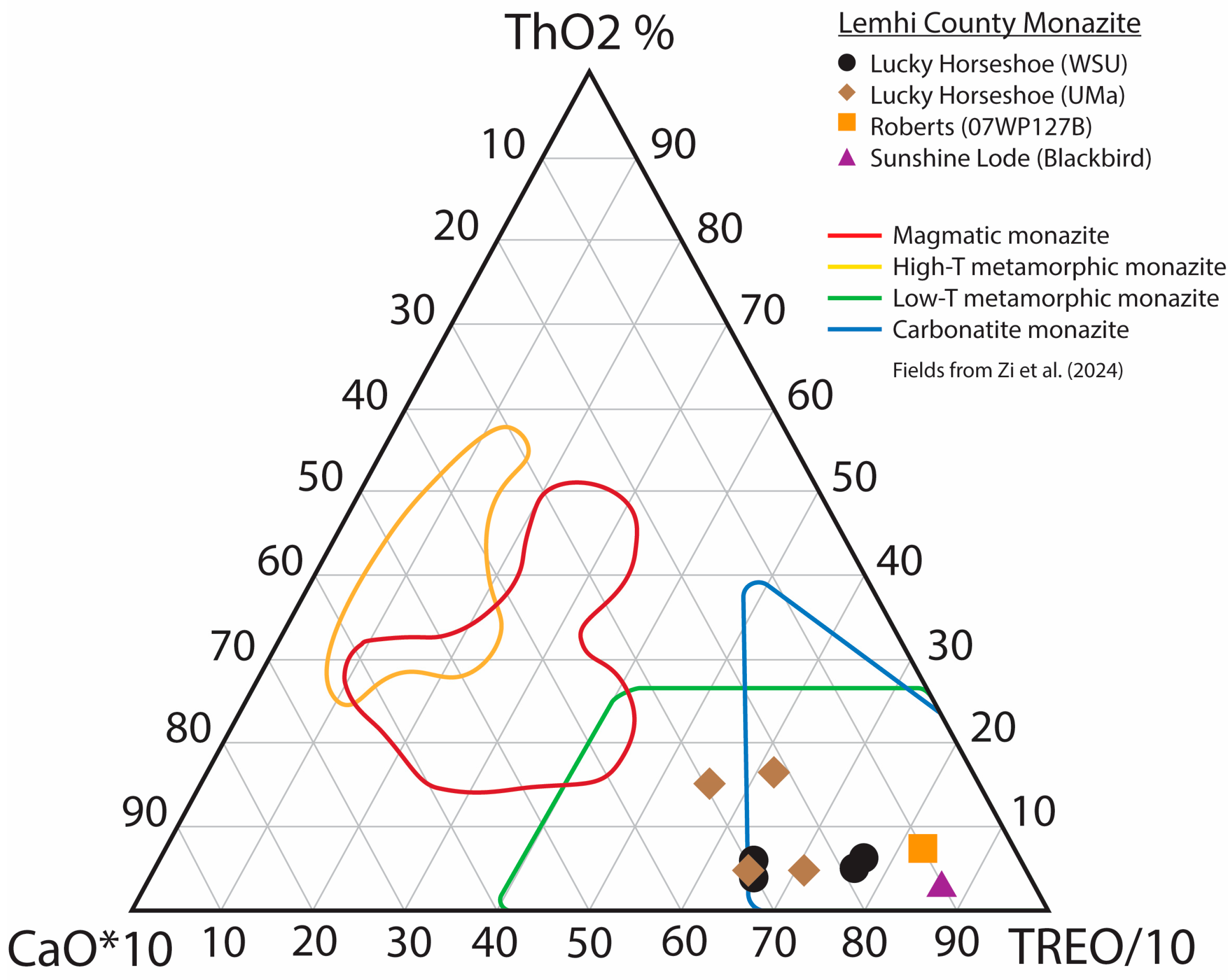 - Related to 2 above, what physiochemical processes can account for the unusual fractionation of Nd (enriched), La and Ce (depleted) relative to more typical igneous or metamorphic monazite? Has supergene (or hypogene) oxidation (common at Lemhi Pass) affected the REE distributions? Some of the most relevant variables, such as oxygen fugacity, salinity, iron content, and relatively high temperature, can be deduced from the geologic characteristics of the district, though additional alteration mapping, isotopic, geochemical, mineralogic, and fluid inclusion work is needed, as well as experimental laboratory work.