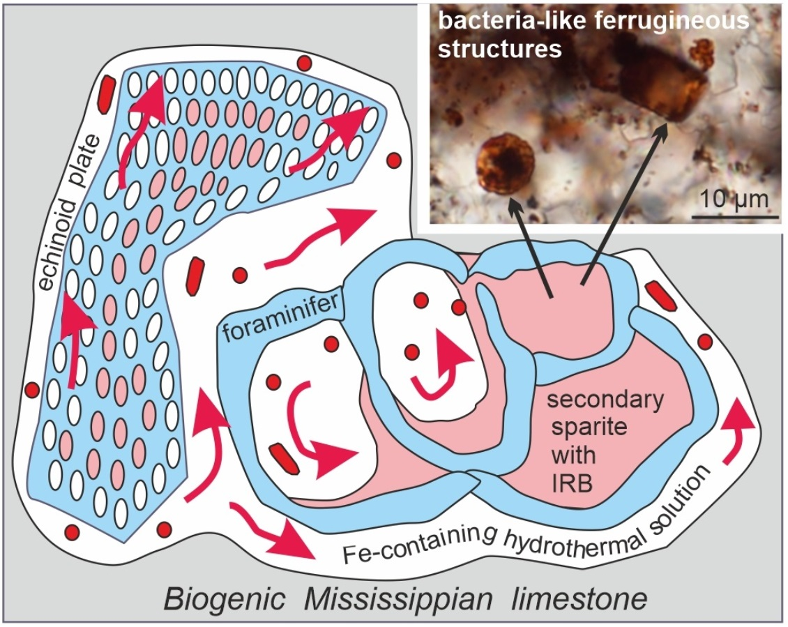 - In the Viséan part of the thick limestone succession located along the Upper Silesian Block (northern part of the Brunovistulicum), there are local zones of red-coloured rocks, which, based on morphological and chemical evidence, have been classified here as bacterial structures. These are spherical or oval forms, 1–2 µm in diameter, that occur as individual capsules or tubes arranged linearly between the walls of calcite crystals. The single capsule is hollow inside and has a wall that is approximately 0.1 µm thick, which contains a large amount of iron oxides and oxyhydroxides; this may be a remnant of the original bacterial sheath. Some oval, dark brown pigment clusters, surrounded by translucent halos with a floccular structure, resemble the bacterial holdfasts. We present here the morphology and chemistry of the microstructures showing their similarities to IRB from the present-day Sphaerotilus-Leptothrix group, the Galionella group, and the Mariprofundus ferrooxydans species.