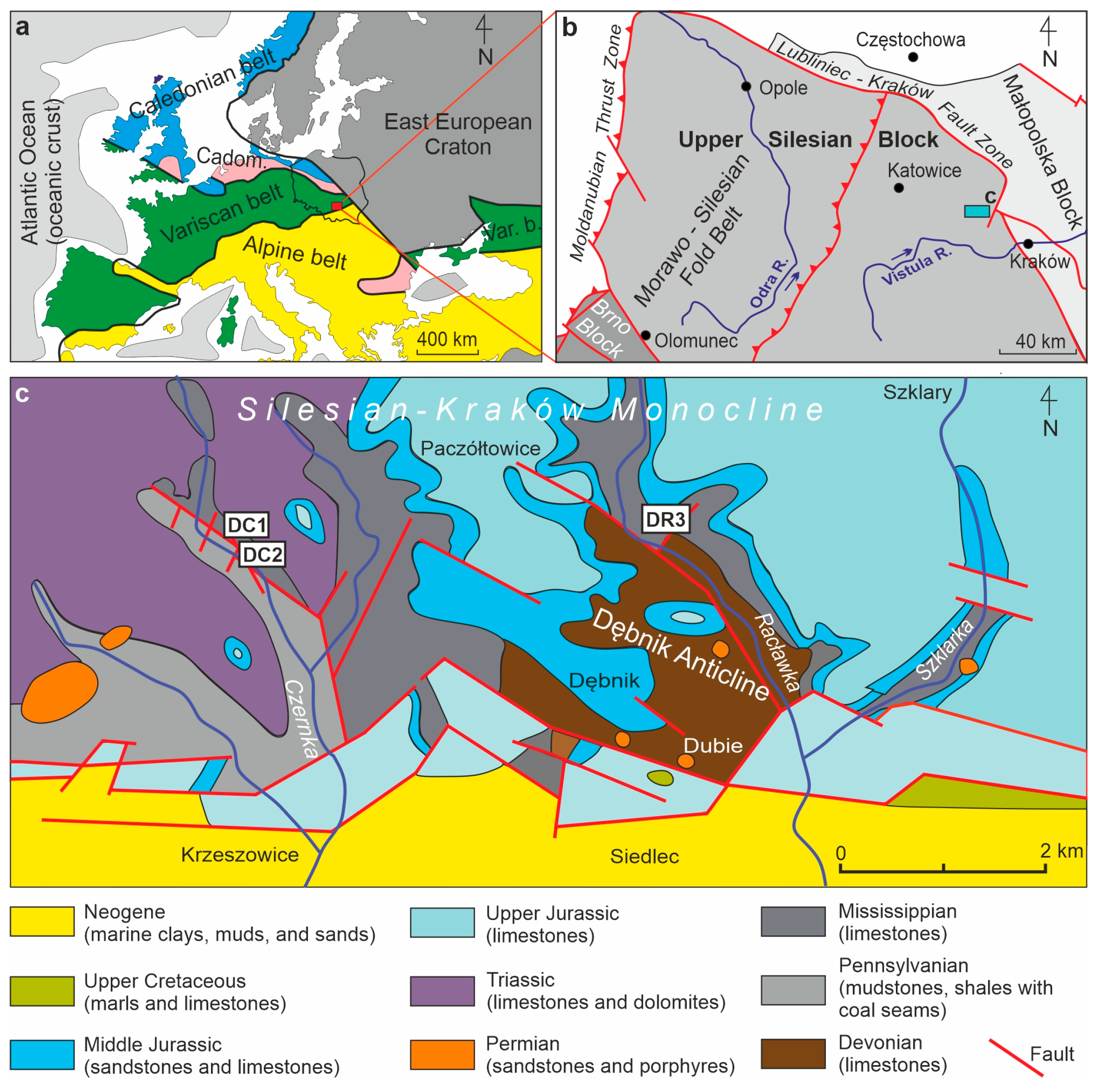 - Dvorák, J.; Galle, A.; Herbig, H.G.; Krejèí, Z.; Malec, J.; Paszkowski, M.; Racki, G.; Skompski, S.; Szulczewski, M.; Żakowa, H. Evolution of the Polish-Moravian carbonate platform in the Late Devonian and Early Carboniferous: Holy Cross Mts., Krakow Upland, Moravian Karst. In XIII International Congress on Carboniferous-Permian; Guide to Excursion B4; Małecka, J., Ed.; Państwowy Instytut Geologiczny: Warszawa, Poland, 1995; pp. 1–35. [Google Scholar]