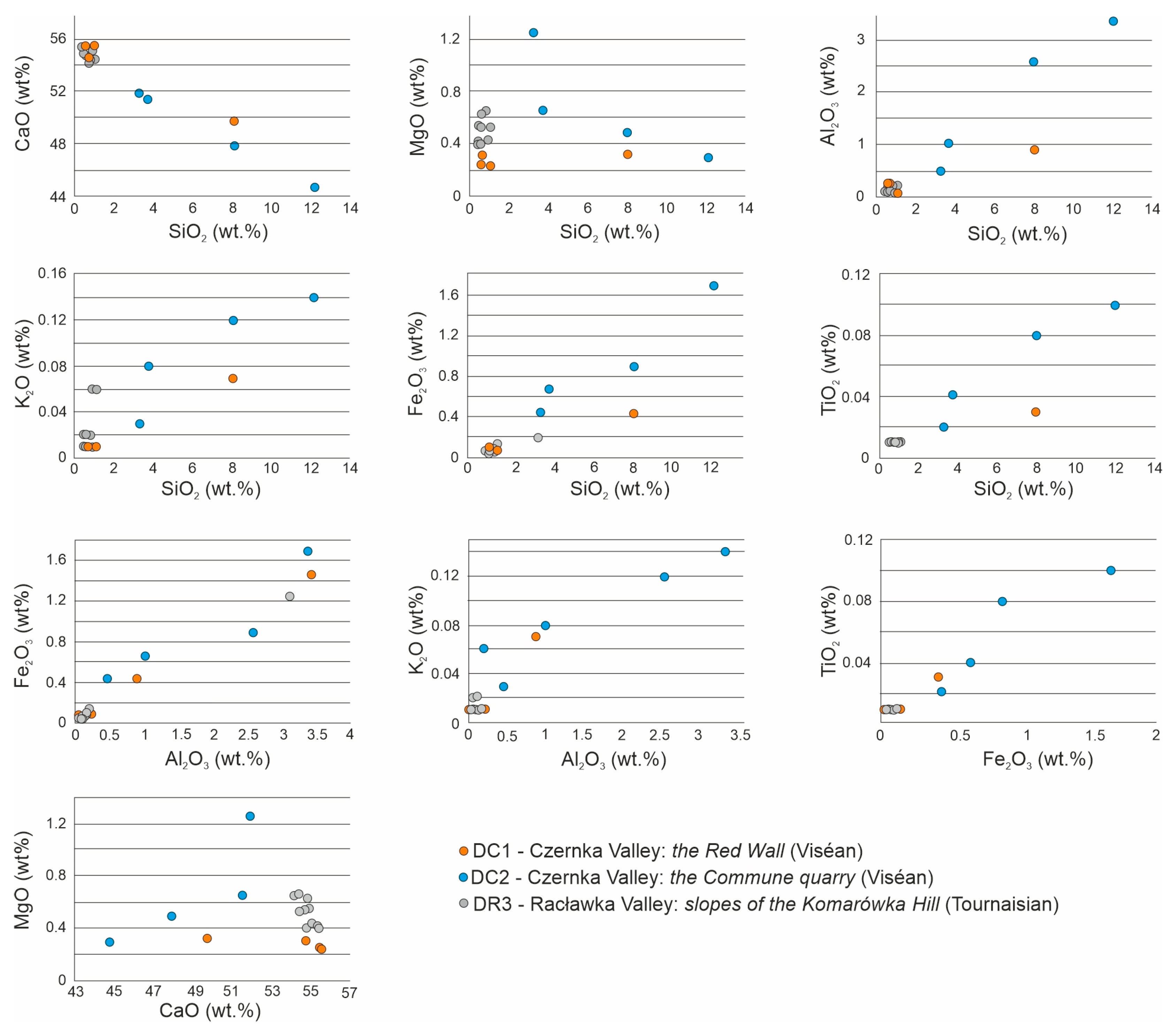 | Σ CaO + LOI | 94.38–82.00 (av. 89.40) | 98.82–90.22 (av. 95.57) | 99.03–98.02 (av. 98.59) |