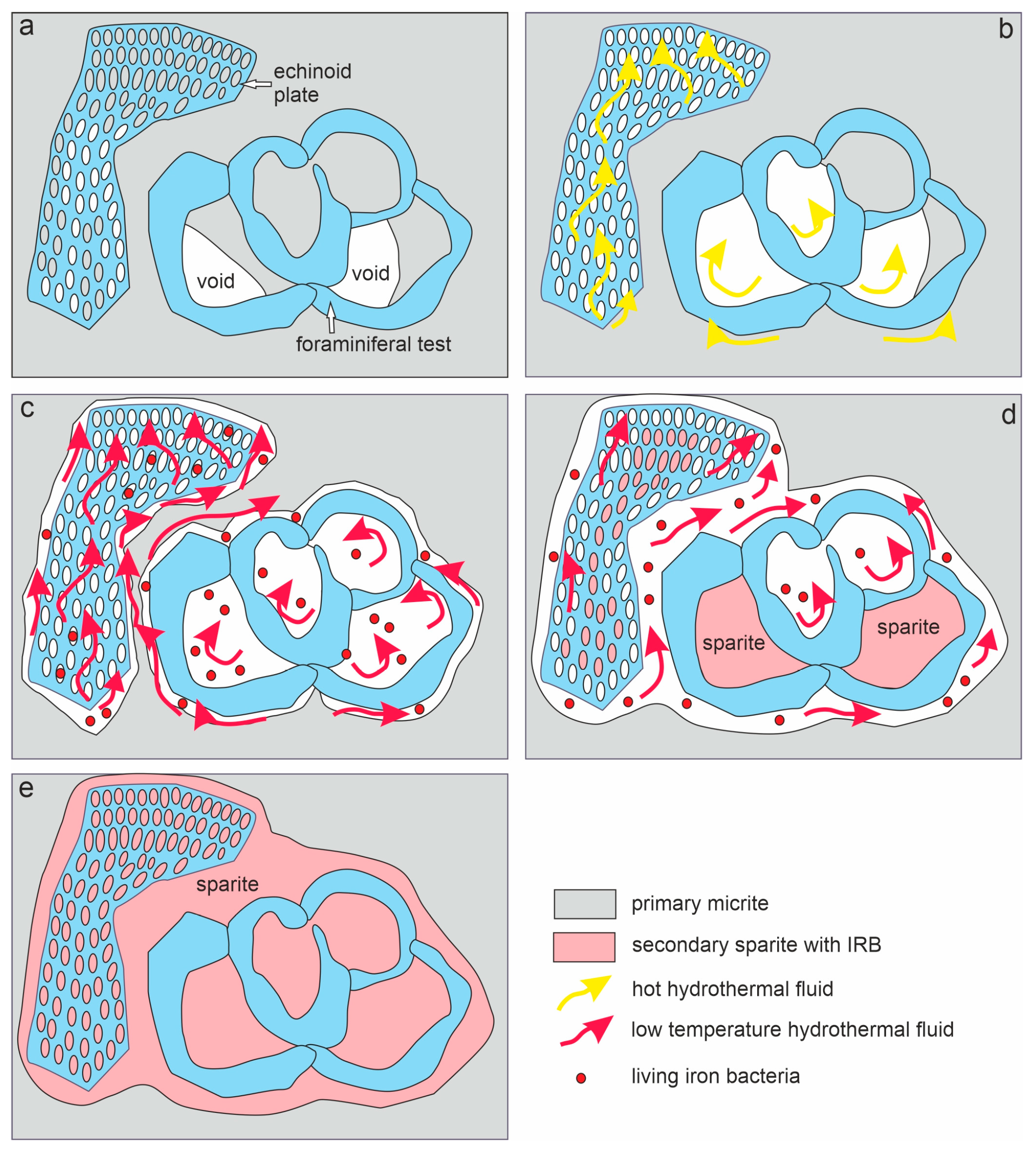 - The taphonomic analysis shows that bacteria-like remnants are not associated with the sedimentation of shallow marine carbonate mud. They are present only in narrow zones that are a few millimetres to several centimetres wide, unrelated to bedding, and they also occur across various microfossils. Based on microfacies analysis, we indicate that bacterial growth occurred in the originally empty micropores of microfossil skeletons and shells, between bioclasts, or in secondary voids formed during the selective dissolution of micrite or smaller sparite crystals. The dissolution of primary micrite and the subsequent filling of spaces with iron oxides/xyhydroxideswere associated with repeated hydrothermal pulses. The solutions must have been relatively cold, which is evidenced by the increased content of Ba, Sr, As, and Sb.