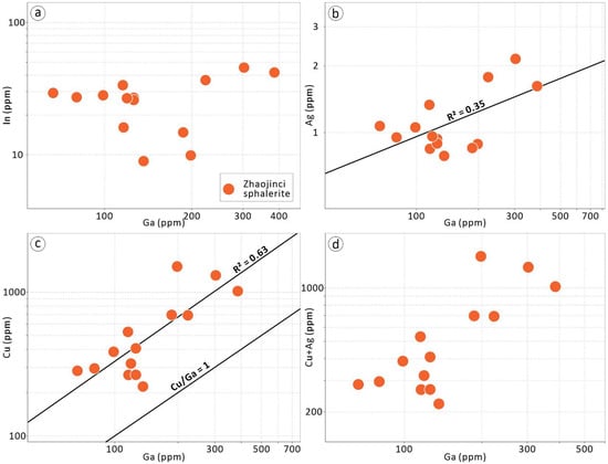 Binary plots of (a) Ga vs. In; (b) Ga vs. Ag; (c) Ga vs. Cu; (d) Ga vs. (Cu + Ag) for the Zhaojinci sphalerite.