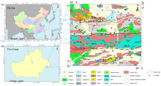 (a) Map of China; (b) geographical location of the eastern Tien Shan research area; (c) geological map of the eastern Tien Shan research area.