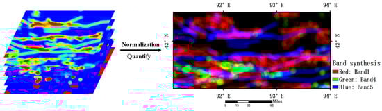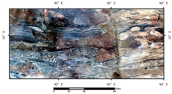 The Landsat 8 satellite is equipped with a push-broom Operational Land Imager (OLI) sensor []. The OLI data are characterized by high geometric stability and a strong signal-to-noise ratio (Table 2). Principal Component Analysis (PCA) is commonly applied to multispectral remote sensing images to extract mineral alteration information []. PCA transforms the original multi-band data into a set of uncorrelated principal components that preserve most of the spectral variance []. The preprocessed Landsat 8-OLI remote sensing images for this study appear in Figure 2.