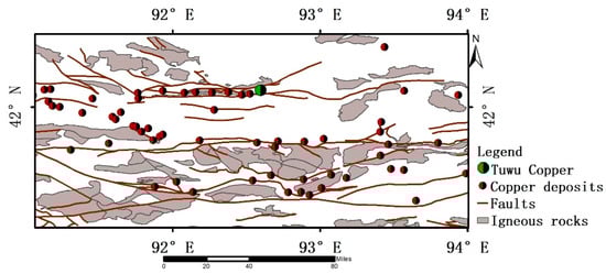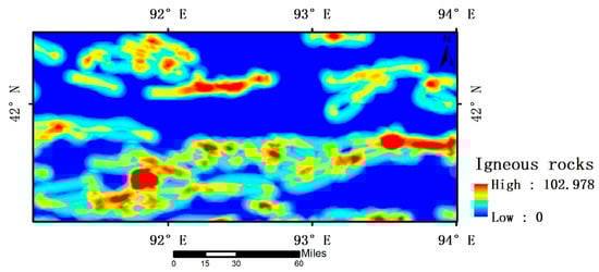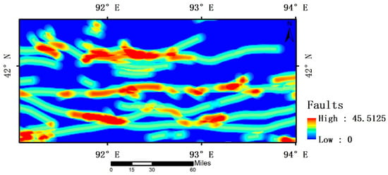 Vector map layers representing magmatic strata and major fault structures were extracted as key evidential layers for mineralization analysis (Figure 4). Additionally, we extract raster layers of igneous rocks (Figure 5) and faults (Figure 6) using the ArcGIS platform to support subsequent spatial modeling and mineralization prediction.