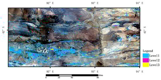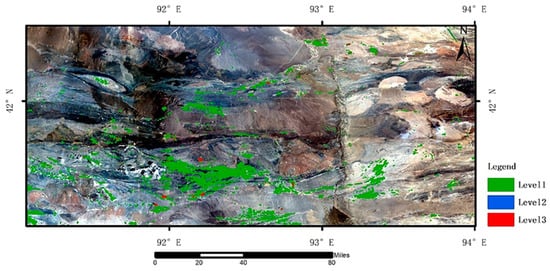 Previous studies have shown that Fe3+ exhibits strong absorption features in OLI Band 5. To enhance iron-stained alteration information, we selected OLI Bands 2, 4, 5, and 6 for PCA processing, as this combination effectively emphasizes the spectral characteristics of iron oxides []. For clay minerals with OH-, most spectral features are near OLI Band 7. Characteristic absorption bands occur around Band 7, and PCA is applied to enhance hydroxyl etching information using OLI Bands 2, 5, 6, and 7. After PCA processing, all etching information was enhanced. We then applied a 4 × 4 Gaussian low-pass filter to the relevant principal component images. We classified the principal components into anomaly classes using the threshold method. To determine the anomaly grade, we used X ten kδ, where δ is the standard deviation and X is the mean value.