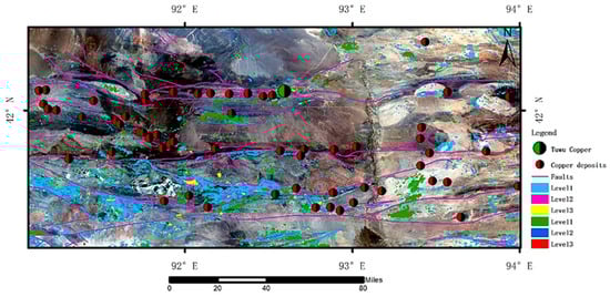 This study utilizes the spectral sensitivity of the Landsat 8 OLI sensor in the near-infrared (NIR) and short-wave infrared (SWIR) bands to extract hydroxyl and iron-stained alteration anomalies through Principal Component Analysis (PCA) (Figure 7, Figure 8 and Figure 9). The classification of anomaly intensity reveals that iron-stained anomalies mainly run along the NNW-SSE direction. Their spatial features closely correspond to the regional structural lineaments. These anomalies display a clear banded pattern along the sides of the Kangguertag-Huangshan fault zone and the Aqikkuduk-Shaquanzi fault zone. Importantly, the areas with concentrated iron-stained anomalies correlate strongly with known copper mineralization points. This suggests that these anomalies can indicate copper enrichment zones.