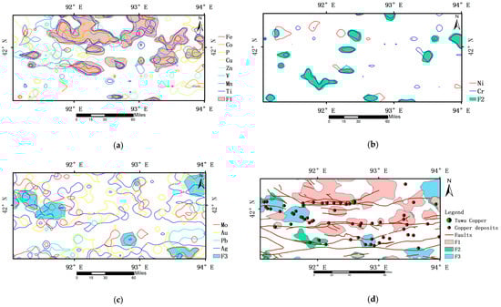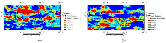 According to the regional geological background and research objectives, the target element is Cu. Therefore, based on correlation analysis and relevant literature references [,], 14 copper-friendly elements were selected, including Ni, Co, Cr, Mn, P, Ti, V, Zn, Fe, Ag, Au, Mo, Pb, in total. Firstly, outliers were removed from the dataset, and the lower limits of anomalies for each element were determined based on the 85% CFM []. The correlation coefficients and lower limits of anomalies between each element and copper are shown in Table 3.