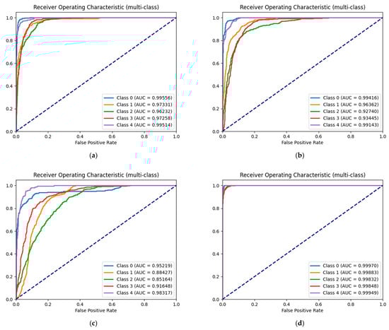 All experiments in this research model were conducted on a workstation (2 × 20-core Intel Gold 6133 CPU, 128 GB memory, and 48 GB VRAM RTX 4090 GPU). Figure 12 presents the ROC curves and AUC values for the four models: (a) WoE, (b) GCN, (c) CNN, and (d) KDCGAT. As shown, the proposed KDCGAT model achieves the highest classification performance across all classes, with AUC values exceeding 0.99 for all categories. The ROC curves of KDCGAT are consistently closer to the upper-left corner, indicating a stronger ability to distinguish between ore-bearing and barren samples.