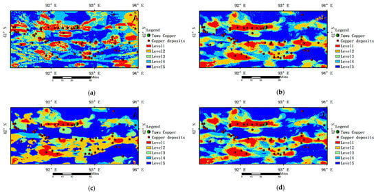 Copper prediction maps for each model: (a) WOE, (b) GCN, (c) CNN, (d) KDCGAT.