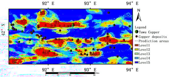 B1, B2, and B3: Although no known copper deposits have been identified within these three prediction zones, they exhibit favorable tectonic, stratigraphic, and magmatic conditions for mineralization. The strong spatial coincidence of geochemical and alteration anomalies indicates promising metallogenic potential. These zones are therefore considered prospective copper targets worthy of further geological and geochemical exploration.