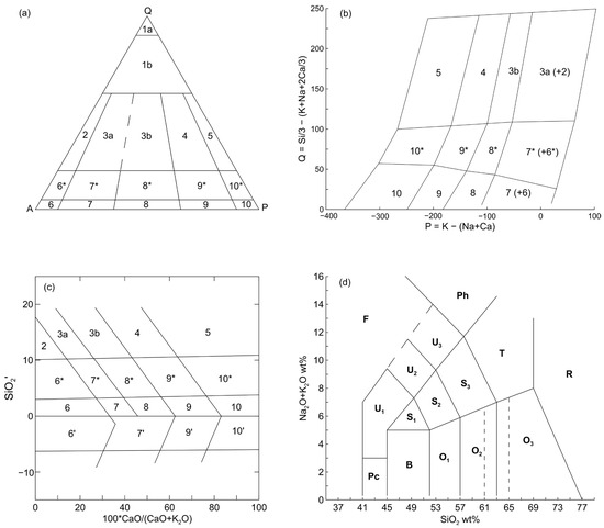 Non-genetic classification diagram for the granitoid rocks. (a) QAP diagram []; (b) P-Q diagram []; (c) SCK diagram [], the axis and boundaries are transformed according to []); (d) TAS diagram (base map boundaries after []; nomenclature after []). 1a—Quartzolite; 1b—Quartz-rich granitoid; 2—Alkali feldspar granite; 3a—Syenogranite; 3b—Monzogranite; 4—Granodiorite; 5—Tonalite; 6*—Quartz alkali feldspar syenite; 7*—Quartz syenite; 8*—Quartz monzonite; 9*—Quartz monzodiorite; 10*—Quartz diorite/quartz gabbro; 6—Alkali feldspar syenite; 7—Syenite; 8—Monzonite; 9—Monzodiorite; 10—Diorite/Gabbro. For SCK diagram: 6′—Feldspathoid syenite; 7′—Feldspathoid monzosyenite; 9′—Feldspathoid monzodiorite; 10′—Olivine/feldspathoid diorite/gabbro. SiO2′ = SiO2 + 20.4 × CaO/(CaO + K2O) − 64.8. For TAS diagram: R—Granite; O3—Granodiorite; O2—Tonalite; O1—Diorite; B—Gabbro; Pc—Olivine gabbro; T—Syenite; S3—Monzonite; S2—Monzodiorite; S1—Monzogabbro; Ph—Feldspathoid syenite; U3—Feldspathoid monzosyenite; U2—Feldspathoid monzodiorite; U1—Feldspathoid gabbro; F—Foidite. The vertical dot lines at SiO2 = 61% and 65% bracket the “Tonalite” region in TAS diagram as proposed by Middlemost [].