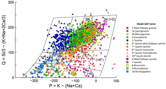 Projection of the compiled data on the P-Q diagram (base map after [,]. 3a(+2)—Syenogranite and Alkali-feldspar granite; 3b—Monzogranite; 4—Granodiorite; 5—Tonalite; 7*(+6*)—Quartz syenite and quartz alkali-feldspar syenite; 8*—Quartz monzonite; 9*—Quartz monzodiorite; 10*—Quartz diorite/quartz gabbro; 7(+6)—Syenite and alkali-feldspar syenite; 8—Monzonite; 9—Monzodiorite; 10—Diorite/Gabbro.