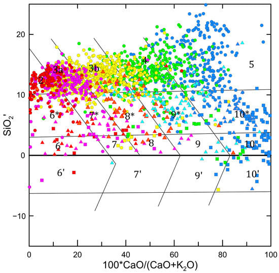 Projection of the compiled data on the SCK diagram (original plot from [], but the axis and boundaries are transformed by SiO2′ = SiO2 + 20.4 × CaO/(CaO + K2O) − 64.8, after []). The legend is the same as in Figure 2. 2—Alkali feldspar granite; 3a—Syenogranite; 3b—Monzogranite; 4—Granodiorite; 5—Tonalite; 6*—Quartz alkali feldspar syenite; 7*—Quartz syenite; 8*—Quartz monzonite; 9*—Quartz monzodiorite; 10*—Quartz diorite/quartz gabbro; 6—Alkali feldspar syenite; 7—Syenite; 8—Monzonite; 9—Monzodiorite; 10—Diorite/Gabbro; 6′—Feldspathoid syenite; 7′—Feldspathoid monzosyenite; 9′—Feldspathoid monzodiorite; 10′—Olivine/feldspathoid diorite/gabbro.