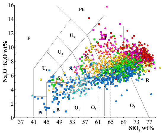 Projection of the compiled data on the TAS diagram (base map boundaries after []; nomenclature after []). The legend is the same as in Figure 2. R—granite; O3—granodiorite; O2—tonalite; O1—quartz diorite; B—gabbro/diorite; Pc—olivine gabbro; T—syenite; S3—monzonite; S2—monzodiorite; S1—monzogabbro; Ph—feldspathoid syenite; U3—feldspathoid monzosyenite; U2—feldspathoid monzodiorite; U1—feldspathoid gabbro; F—foidite. The vertical dot lines at SiO2 = 61% and 65% bracket the “Tonalite” region in TAS diagram as proposed by Middlemost [] (pp. 47–48).