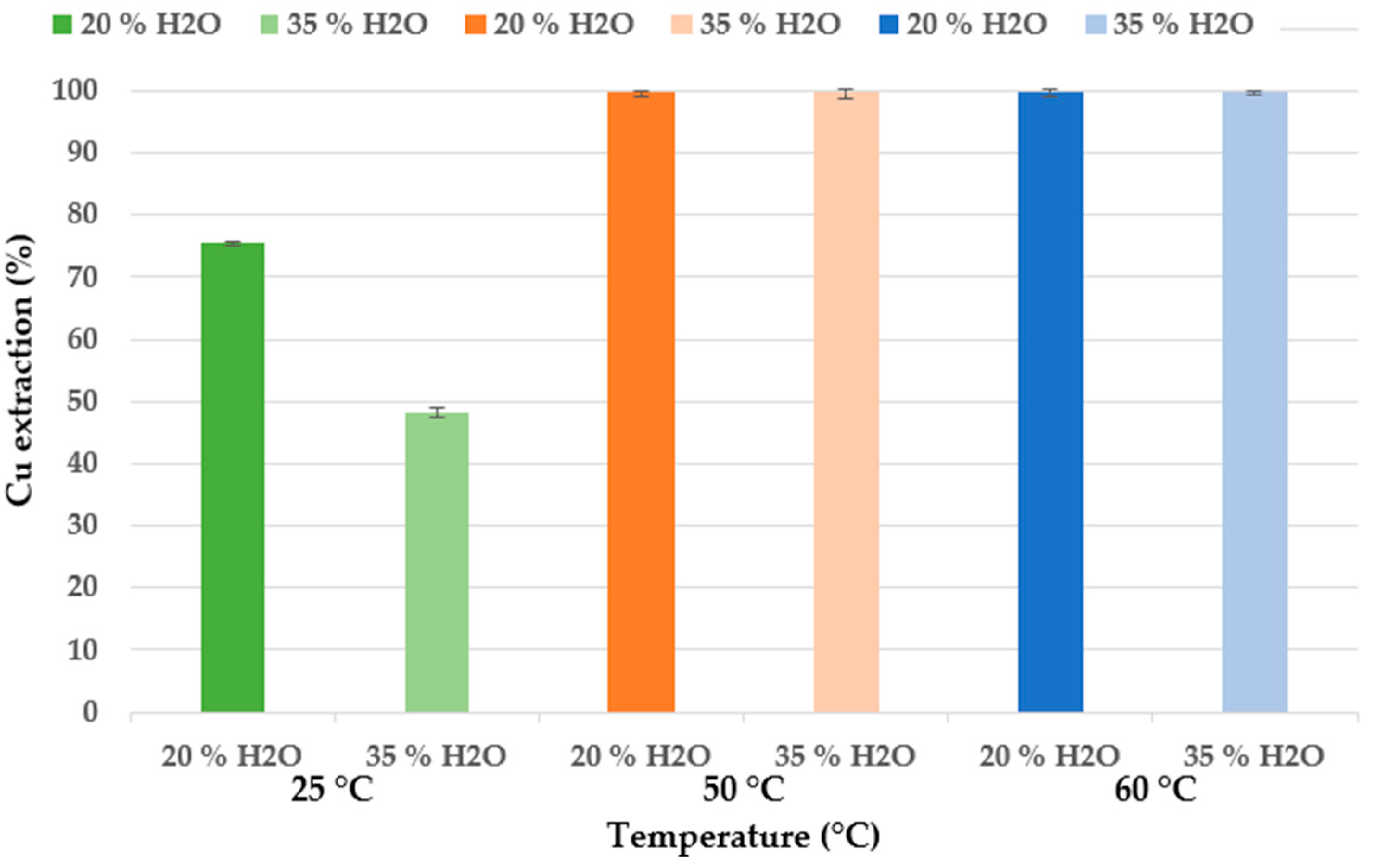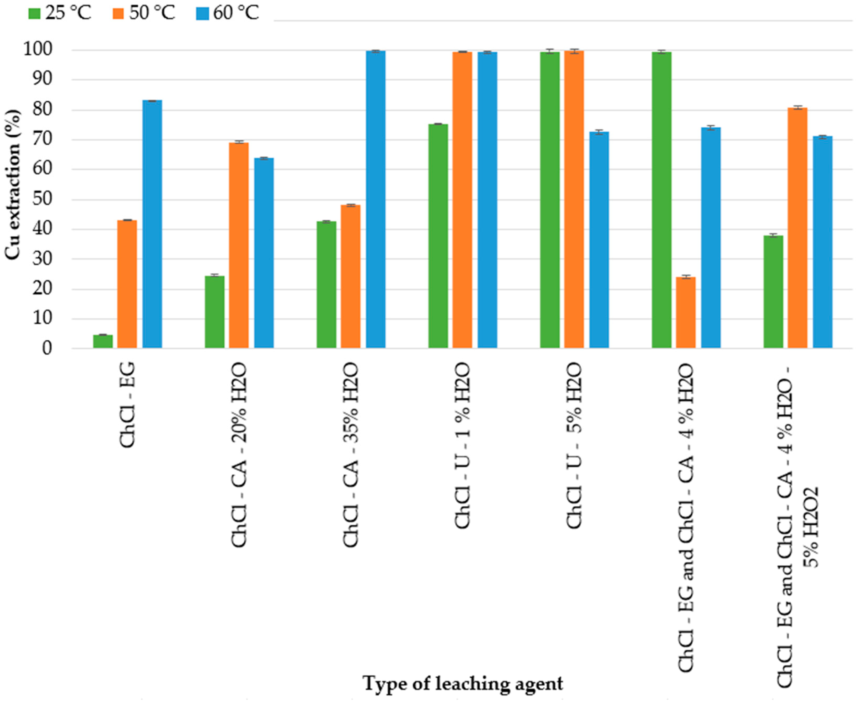 | ChCl-ethylene glycol ChCl-oxalic acid ChCl-malonic acid ChCl-ethylene glycol-oxalic acid ChCl-ethylene glycol-malonic acid ChCl-oxalic acid-malonic acid | Chalcopyrite concentrate | 1st stage: 75 °C, 48 h, 1 g/20 mL, 400 rpm. 2nd stage: DES ChCl-ethylene glycol-oxalic acid, temperature (45, 55, 65 and 75 °C), leaching time (2, 6, 12, 24, 48 and 72 h), solid liquid ratio (0.025; 0.05; 0.075; 0.1 g/mL), water addition (5; 20; 35; 50%v/v) | 86% Cu at 75 °C, 48 h, 0.025 g/mL, ChCl-ethylene glycol-oxalic acid−20% vol. water | Shiri et al. [34] |