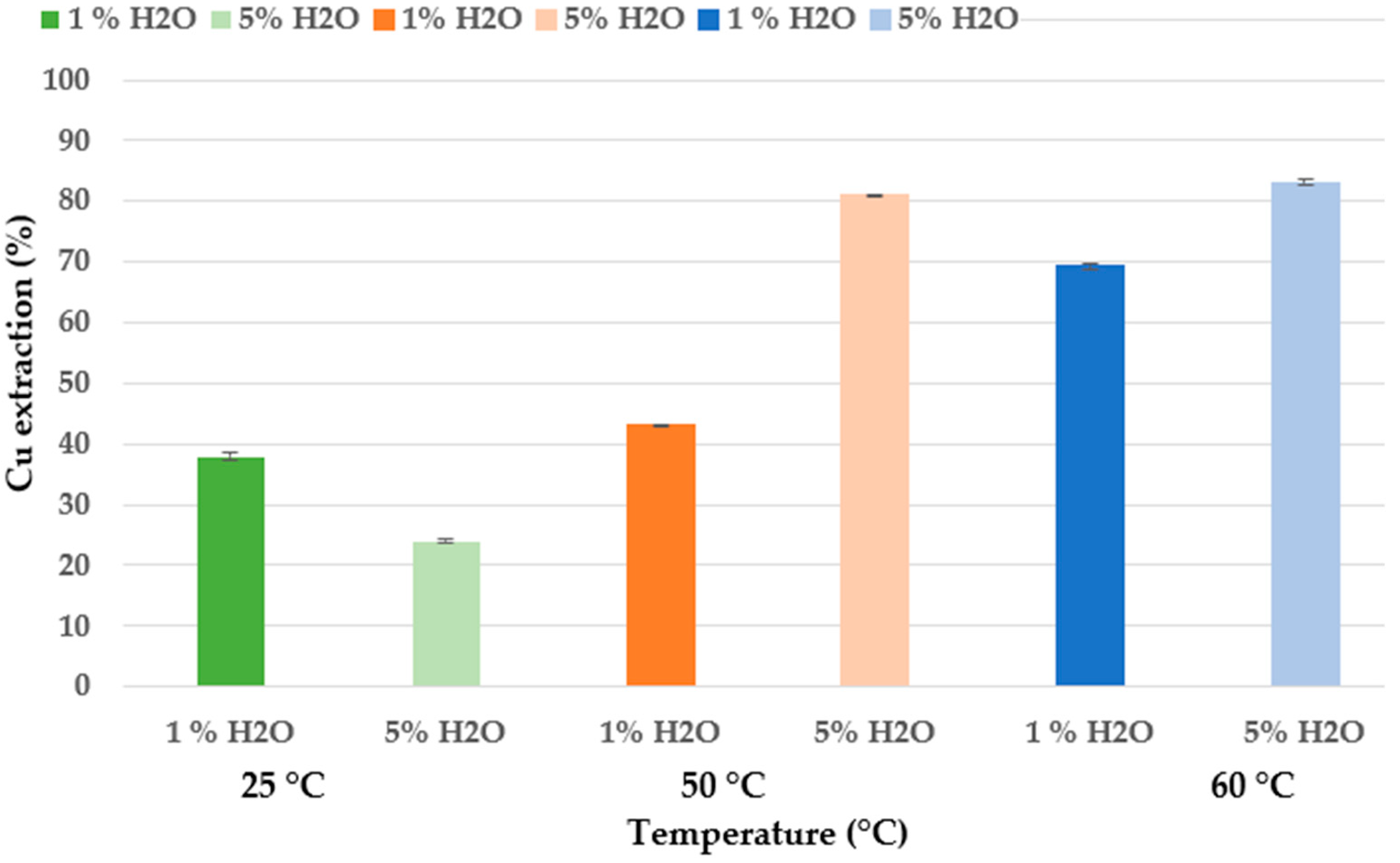 | ChCl-ρ-toluenesulfonic acid | Chalcopyrite concentrate | Temperature (40; 60; 80; 100 and 120 °C), leaching time (1; 2; 3; 4 and 5 h), stirrer speed (100; 300; 500; 700 and 900 rpm), mass ratio DES/chalcopyrite (20; 40; 60; 80 and 100 g/g) | 73.6% Cu in 1 h, mass ratio DES/chalcopyrite of 100, 120 °C, 100 rpm | Behnajady et al. [37] |