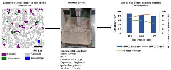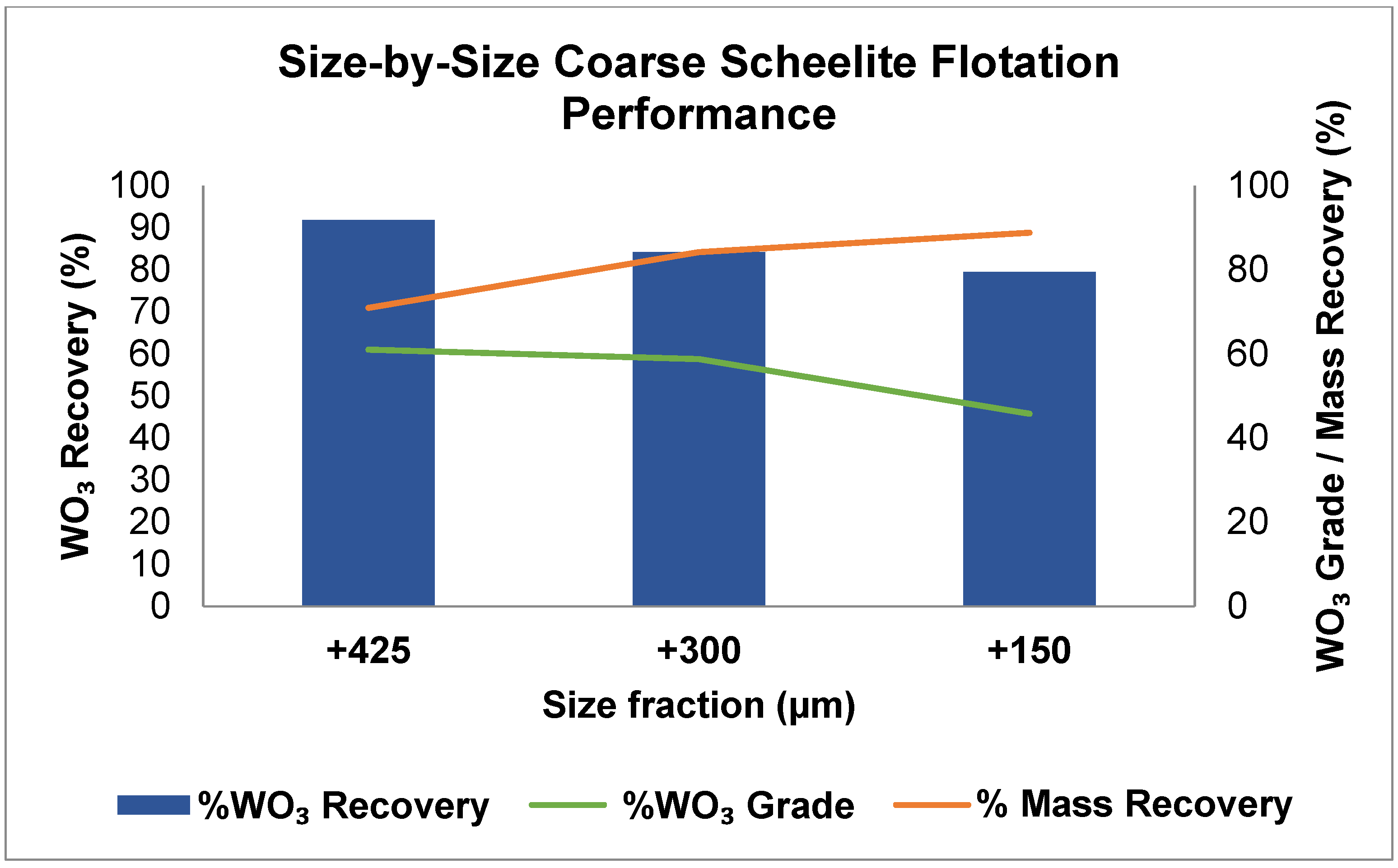 The flotation tests achieved high scheelite recoveries for coarse particle size fractions, with peak performance observed in the +425 µm fraction (91.76%WO