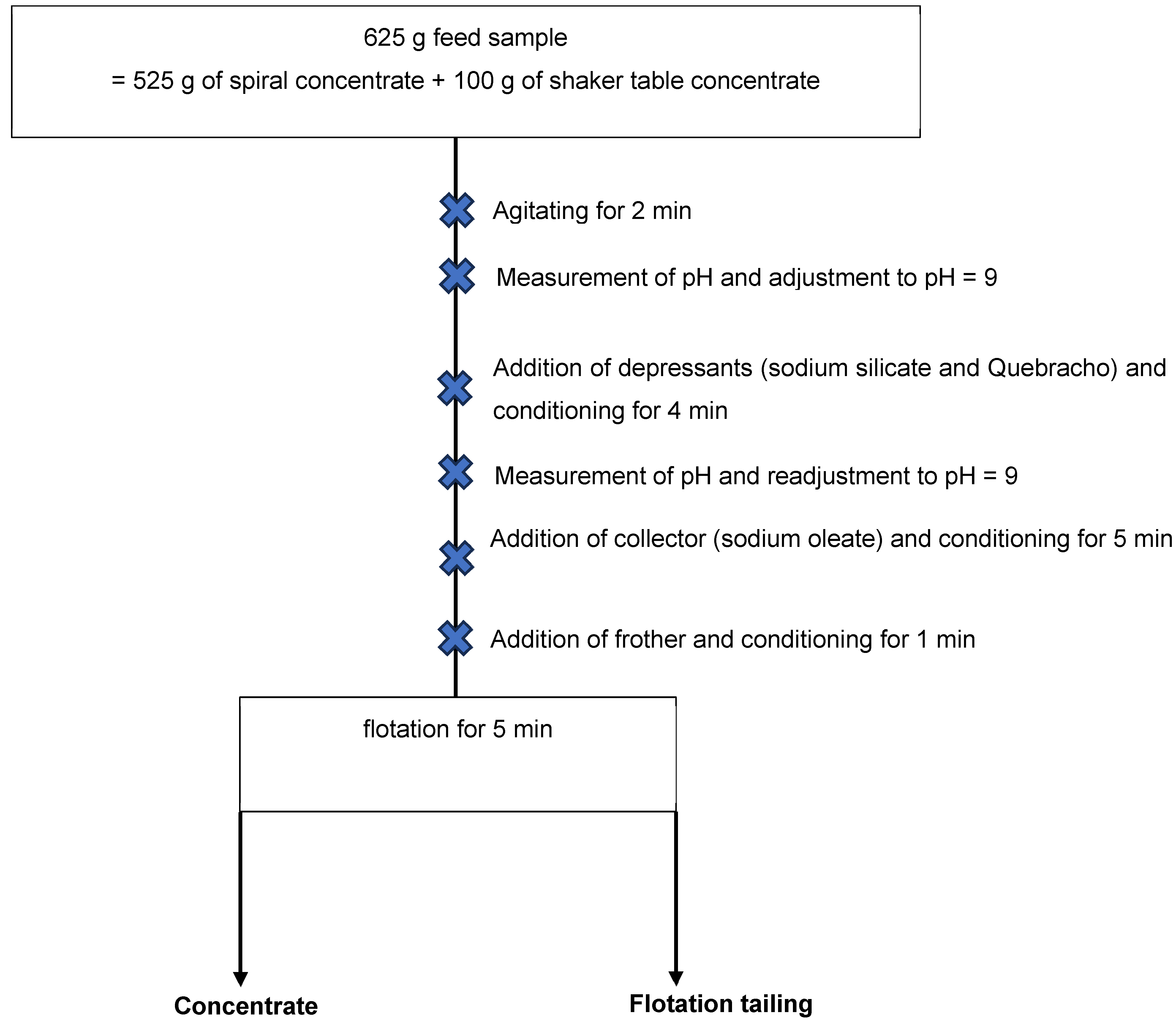 3 and 4 g/t of quebracho), and the resulting mix was conditioned for 4 min. Subsequently, the pH was measured and readjusted to 9 if needed. Next, a collector (5 g/t of NaOl) was introduced, and the slurry was conditioned for 5 min. Then a frother (1 g/t of 2-ethylhexanol) was added and the mixture conditioned for 1 min prior to flotation (steps used for the flotation experiments are shown in