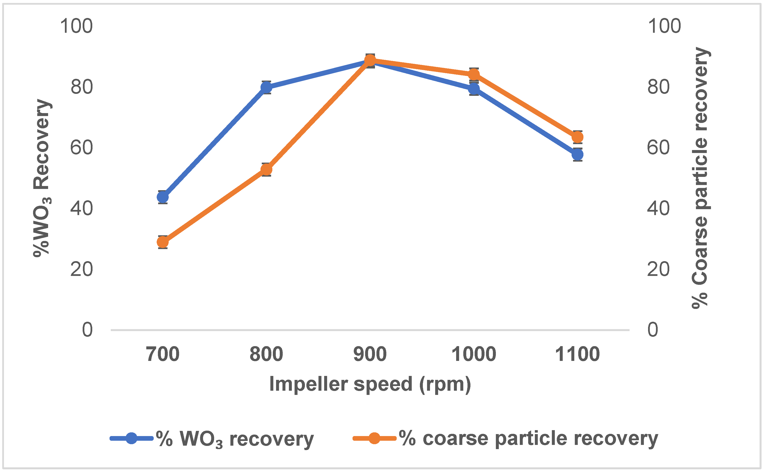 3/s, the system provided adequate bubble–particle interactions while minimising turbulent detachment. These results confirm that high-grade recovery of coarse scheelite particles (+425 µm) can be successfully achieved through the integration of a targeted reagent scheme and optimised hydrodynamics conditions.