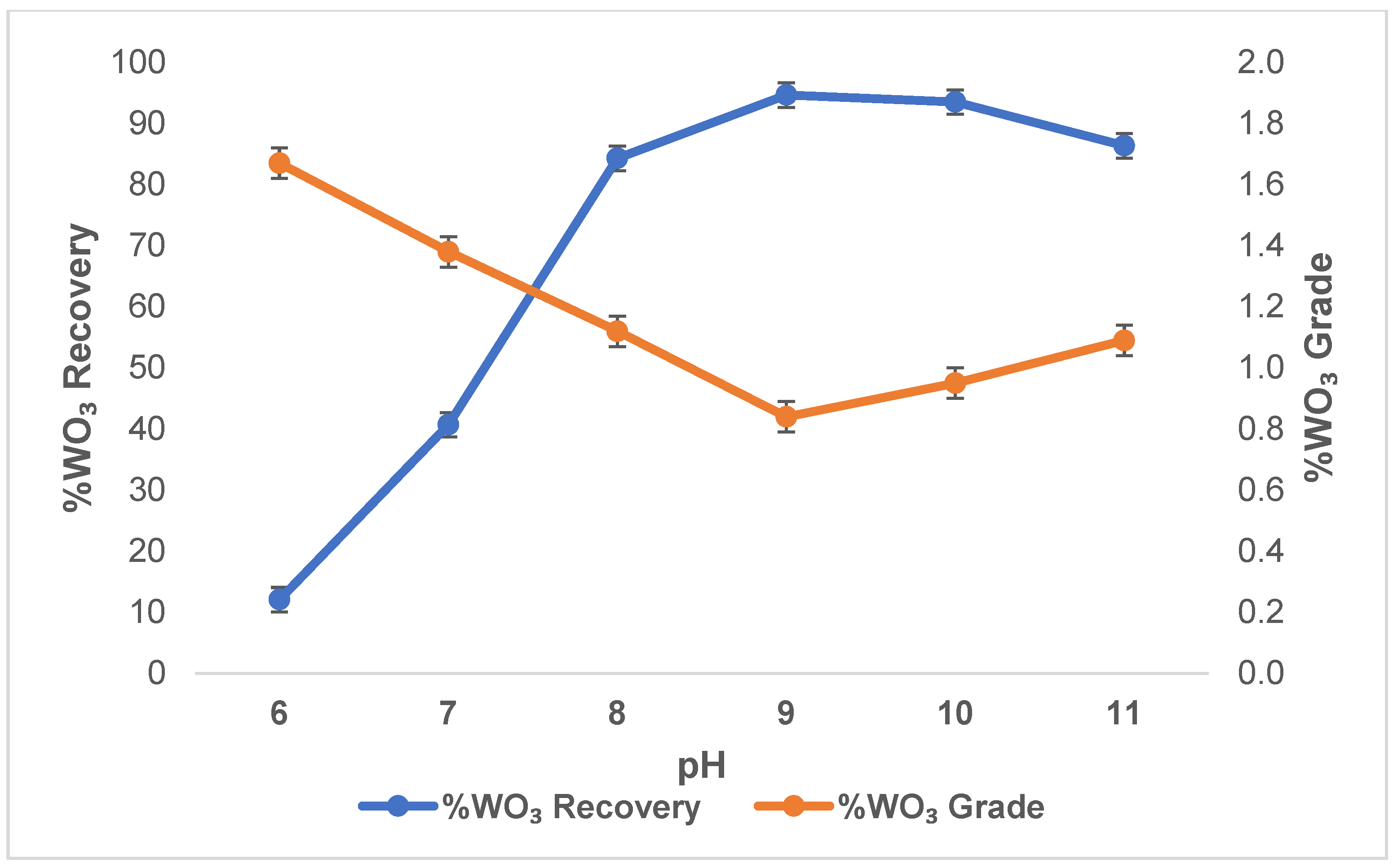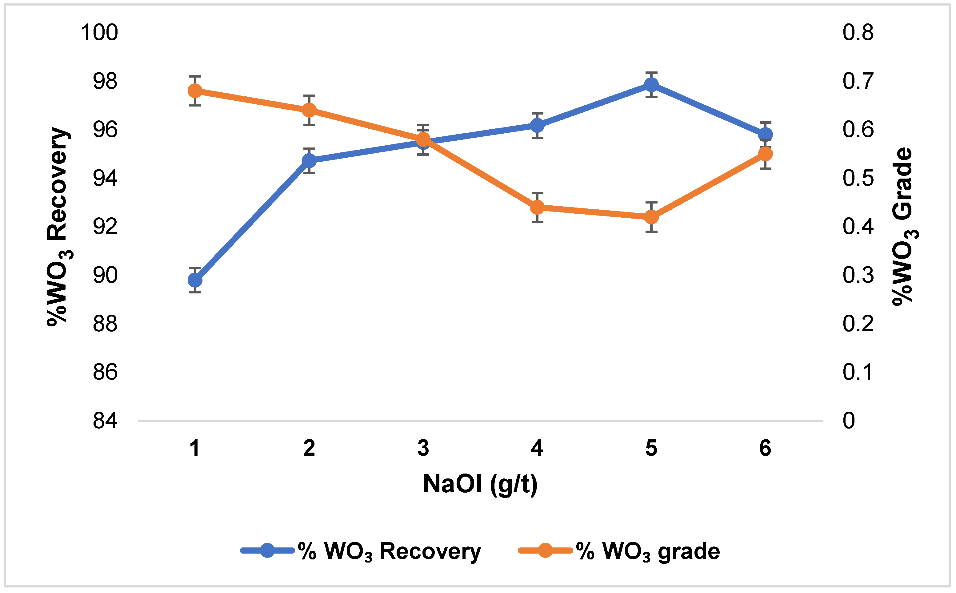 Figure 8 illustrates the grade and recovery of the concentrate in relation to the quantity of NaOl added as a collector. As the dosage of the collector increased, the recovery progressively improved and reached its peak at 5 g/t of NaOl with a recovery of 97.8% and a grade of 0.42% WO