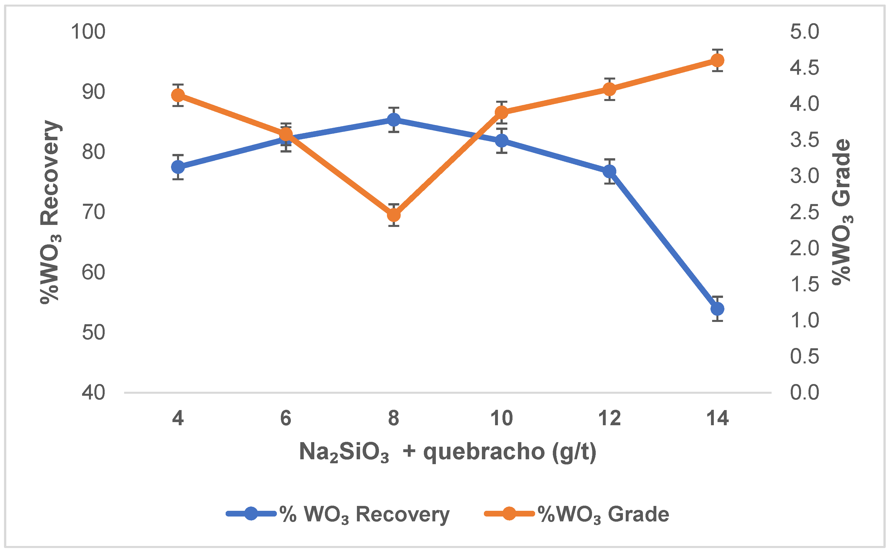 The effect of Na2SiO3 plus quebracho dosage on % WO3 recovery and grade. Other parameters (NaOl 5 g/t, pH 9, and impeller speed 900 rpm) were held constant.