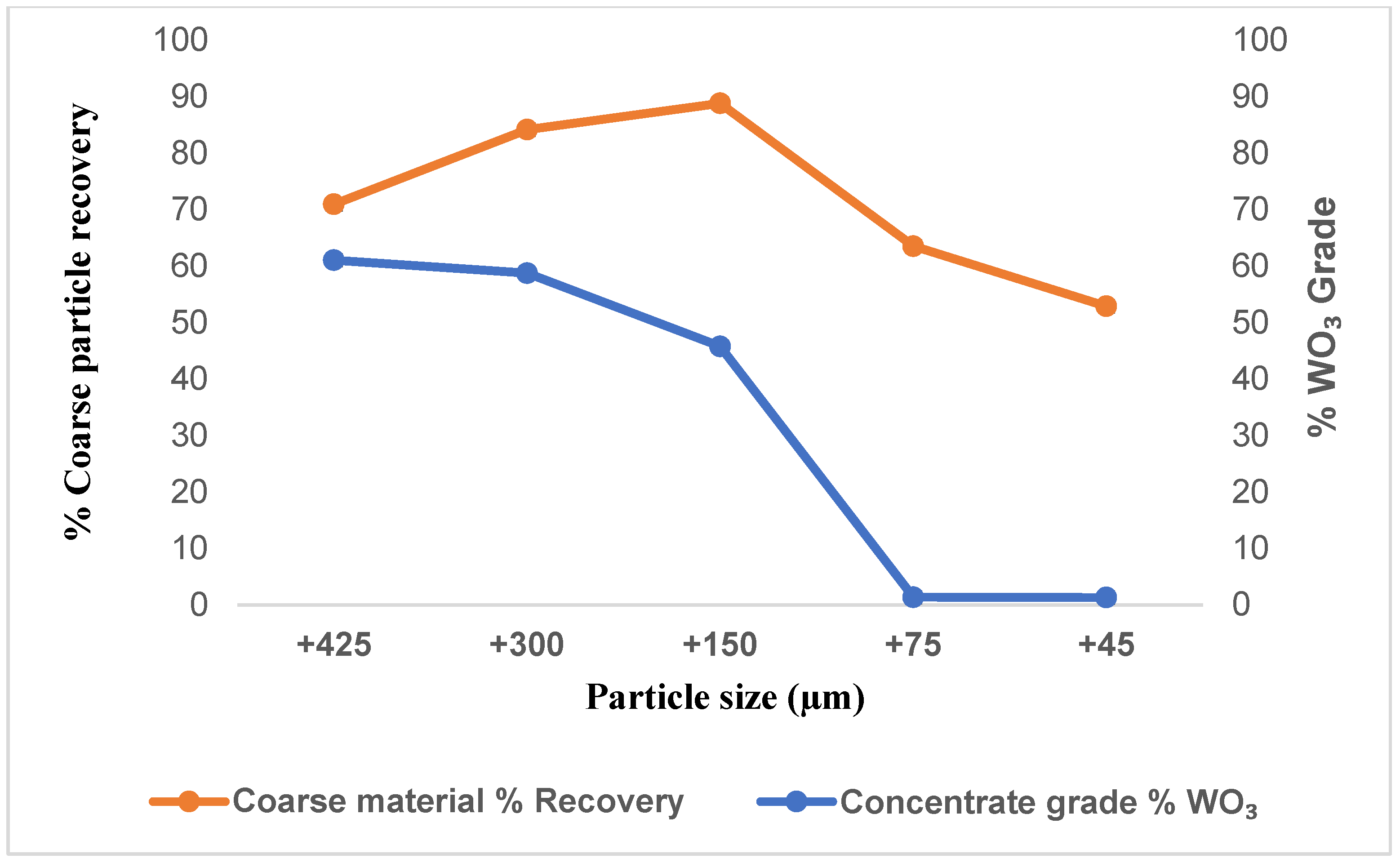 3 content at 61.03%, followed by 58.73% and 45.76% for the +300 µm and +150 µm fractions, respectively. This trend highlights the favourable flotation response of coarser scheelite particles under the tested reagents scheme and hydrodynamic conditions. This trend is consistent with previous studies suggesting that flotation cell hydrodynamics, particularly bubble–particle collision efficiency and reduced detachment, are critical for coarse particle recovery [