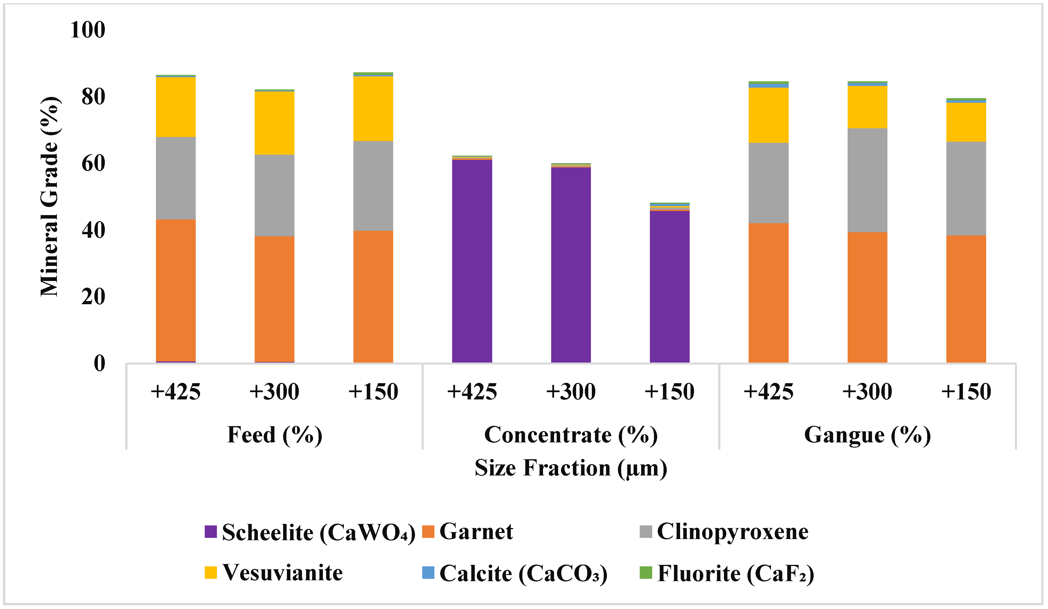 Figure 11). These results can be attributed to the higher proportion of liberated scheelite observed in these size classes, as confirmed by mineralogical mapping (