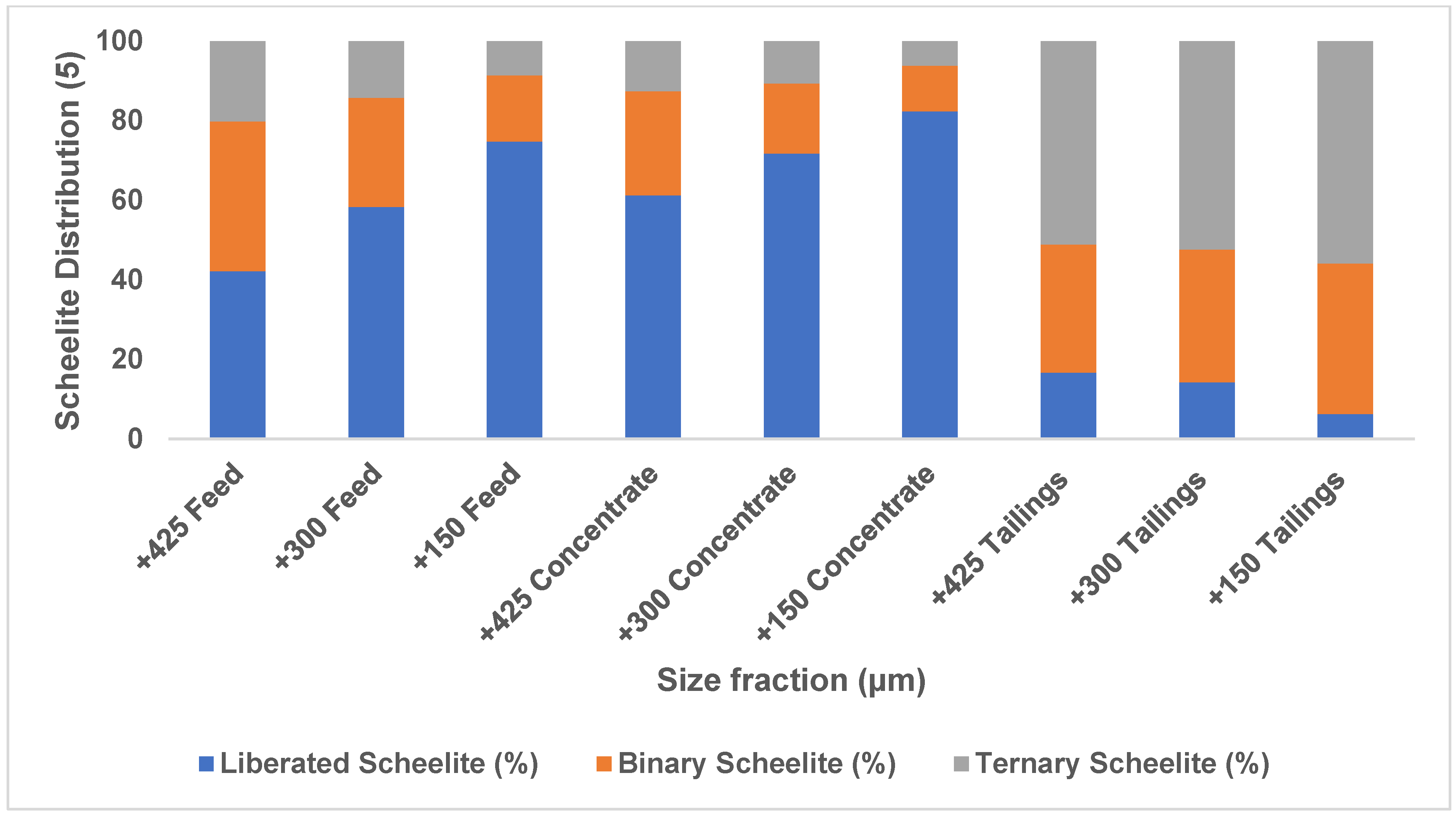 For the +150 µm fraction, recoveries were slightly lower (~80%), with 82.3% liberated, 11.1% binary, and 6.2% ternary scheelite still accounting for the majority of the concentrate (