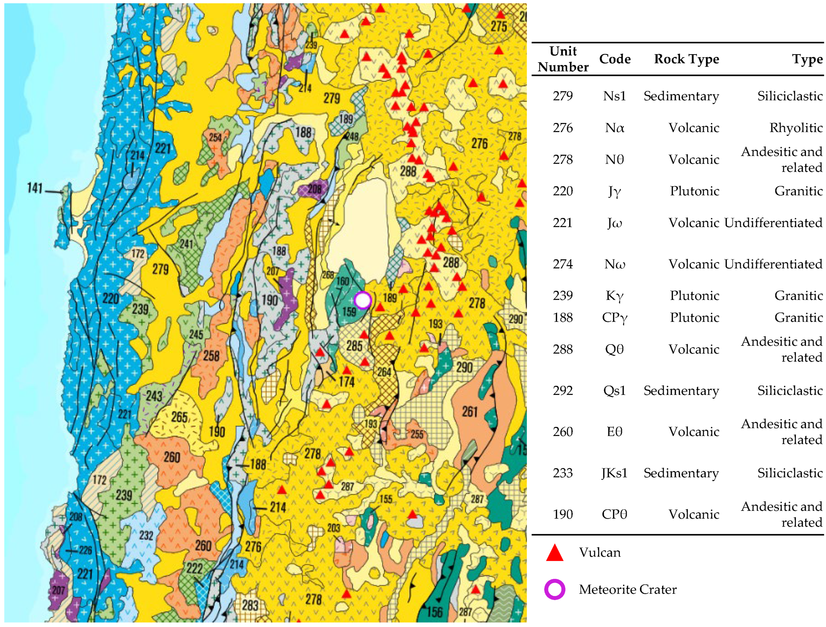 | Taltal | Not specified | SERNAGEOMIN | J | Volcanic | Jurassic | Jurassic | 3 | 0 | 1 | 2 |