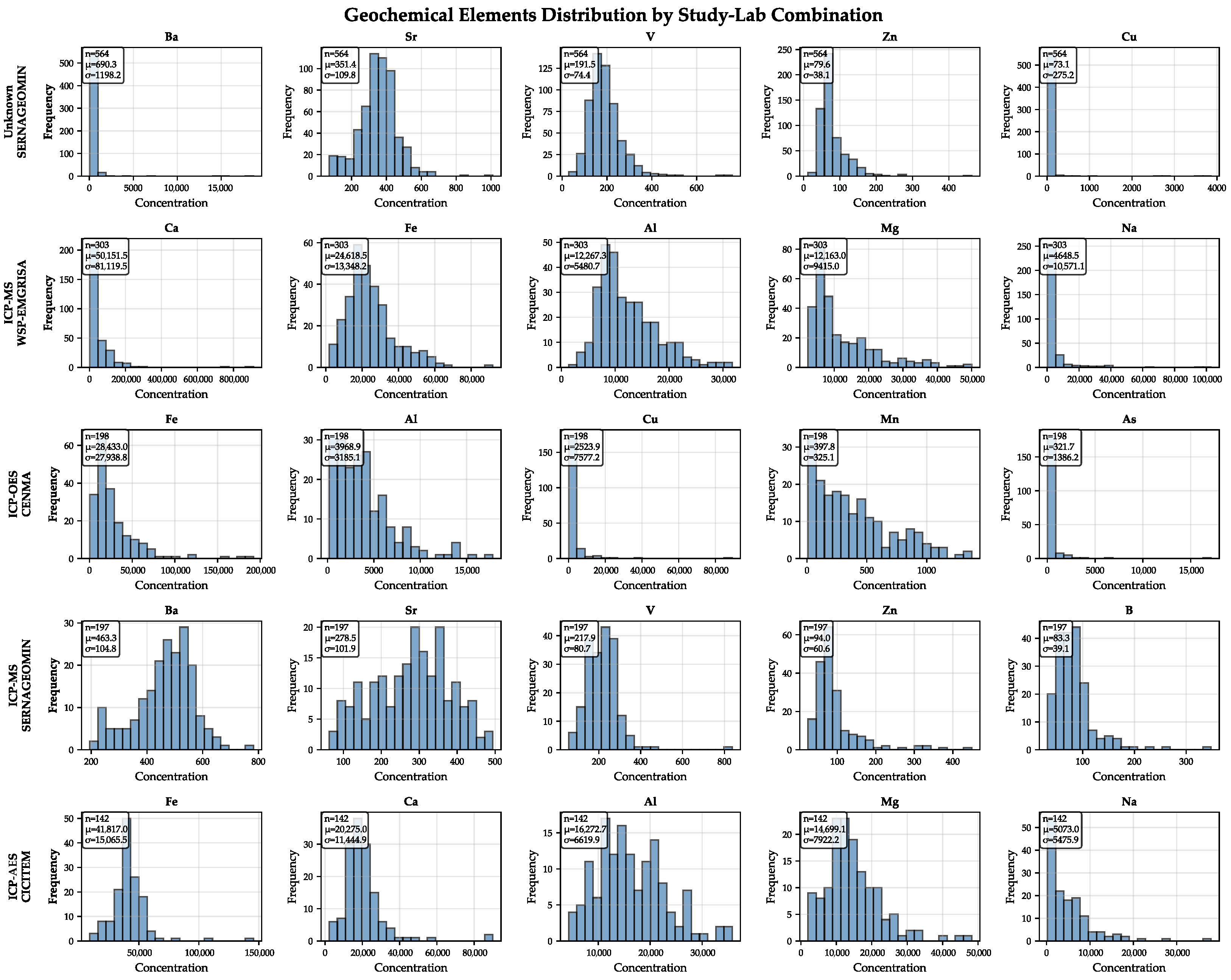 | Element | ICP-MS + CICITEM (All) | ICP-MS + CICITEM (No Anomalies) | ICP-MS + SERNAGEOMIN (All) | ICP-MS + SERNAGEOMIN (No Anomalies) | ICP-MS + WSP-EMGRISA (All) | ICP-MS + WSP-EMGRISA (No Anomalies) | ICP-OES + CENMA (All) | ICP-OES + CENMA (No Anomalies) | N/A + SERNAGEOMIN (All) | N/A + SERNAGEOMIN (No Anomalies) |