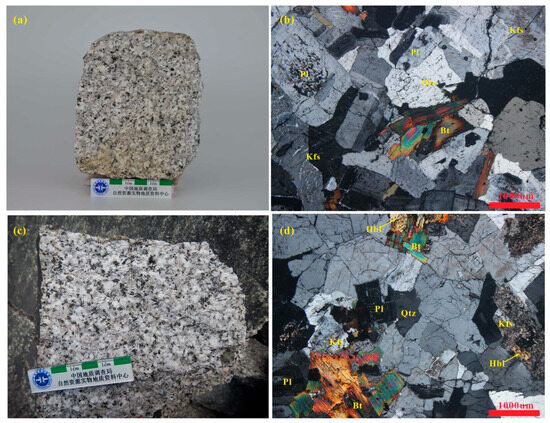Samples and photomicrographs of the Ranwu granite. (a,b) Monzogranite; (c,d) granodiorite. Abbreviations: Qtz = quartz, Kfs = K-feldspar, Pl = plagioclase, Bt = biotite, Hbl = hornblende.