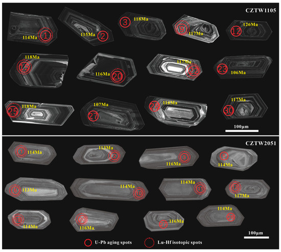 In situ zircon Lu-Hf isotope analysis was conducted at Wuhan SampleSolution Analytical Technology Co., Ltd. using a laser ablation multi-collector ICP-MS (LA-MC-ICP-MS) system. The setup consisted of a GeoLas HD laser ablation system (Coherent, Göttingen, Germany) coupled to a Neptune Plus MC-ICP-MS (Thermo Fisher Scientific, Bremen, Germany). Analyses were performed with a laser energy density of ~10.0 J/cm2 in single-spot mode using a 44 μm spot size. Instrumental conditions and data acquisition protocols were described by Xu et al. (2004) [22]. The standard zircon 91500 was used in this correction to the 176Yb–176Hf interference, showing variable 176Yb/177Hf ratios of 0.0113–0.0122 with an average of 0.0118 for 91500. The 176Lu decay constant of λ = 1.867 × 10−11 yr−1 [23] was used to calculate the initial 176Hf/177Hf ratios. The chondritic values of 176Hf/177Hf = 0.0332 and 176Lu/177Hf = 0.282772 [24] were used in our calculation of the εHf(t) values. The depleted mantle evolution line is defined by (176Hf/177Hf)DM = 0.28325 and (176Lu/177Hf)DM = 0.0384 [25]. An 176Lu/177Hf ratio of 0.015 for the mean continental crust was used to calculate TDMC.