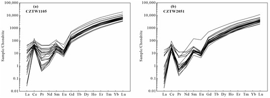 Chondrite-normalized REE patterns of zircons from the Ranwu pluton (normalization values after Sun and McDonough, 1989) [27]. (a) Monzogranite sample CZTW1105; (b) Granodiorite sample CZTW2051.