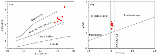 SiO2 vs. K2O (a) and A/CNK vs. A/NK (b) diagrams of the Ranwu granites [28,29].