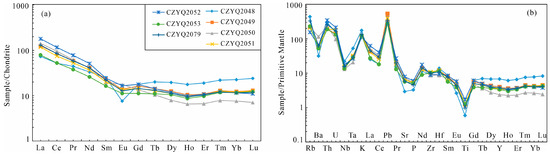 Total rare earth elements (ΣREE) are relatively low, ranging from 79.70 ppm to 161.61 ppm. Chondrite-normalized REE patterns show a distinct right-inclined shape (Figure 7a), with enrichment in light rare earth elements (LREEs), LREE/HREE ratios of 3.94–14.5, and (La/Yb)N ratios of 3.2–18.7. Except for sample CZYQ2050 with δEu = 1.06, the δEu values of other samples range from 0.35 to 0.82, showing mostly weak negative Eu anomalies. In the primitive mantle-normalized trace element diagram (Figure 7b), large-ion lithophile elements (LILEs) such as Rb, Th, U, K, and Pb are relatively enriched, whereas high-field-strength elements (HFSEs) such as Nb, Ta, P, Zr, and Ti are significantly depleted.